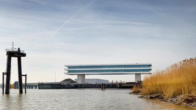“Een visitekaartje dat aantoont wie we zijn en wat we aandurven”, antwoordt hoofdprojectleider Gert Hoefnagels wanneer we hem vragen welk gebouw Cordeel voor ogen had toen het besliste om een nieuw kantoor op te trekken op de Boelwerf in Temse. “Aangezien onze productieafdelingen de voorbije jaren naar De Zaat verhuisd zijn, waar we eerder al enkele residentiële projecten en een kmo-zone realiseerden, lag het voor de hand om daar in de buurt ook onze hoofdzetel te vestigen”, legt Hoefnagels uit. “Op de site van de voormalige Boelwerf hadden we nog een gedeelte achter de hand gehouden met het oog op een eventuele uitbreiding. De aanwezigheid van het droogdok biedt ons overigens de nodige opportuniteiten voor het transport van grondstoffen en afgewerkte materialen. Aangezien we onze activiteiten op en rond het droogdok niet wilden belemmeren en toch 5.000 m² nieuwe kantooroppervlakte wilden realiseren, hebben we besloten om het gebouw over het water te bouwen. Het torent 20 meter boven de waterspiegel uit, zodat er op termijn probleemloos schepen onderdoor kunnen varen om de meerwaarde van het oude droogdok te kunnen benutten.”