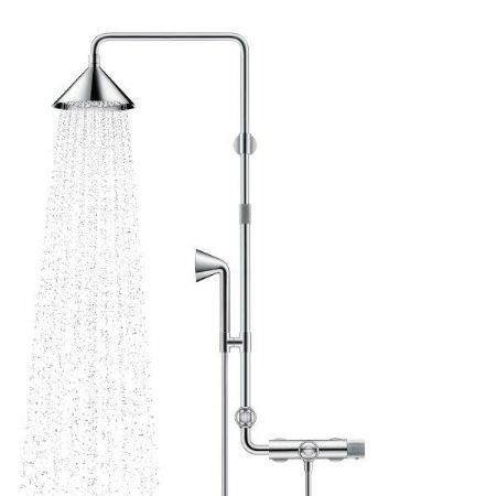 Stralen wisselen kan via de Selectknop in het midden van de hoofddouche. Er is keuze tussen Rain (17 liter per minuut) of RainAir (16 liter per minuut). De hoofddouche is in de hoogte aanpasbaar over 300 mm en ook zwenkbaar. Ergonomisch thermostaatgebruik dankzij ribbels, Intuïtief gebruik door logische plaatsing bedieningsgrepen. Temperatuur is makkelijk en accuraat in te stellen. De handdouche verbruikt 9 liter per minuut.