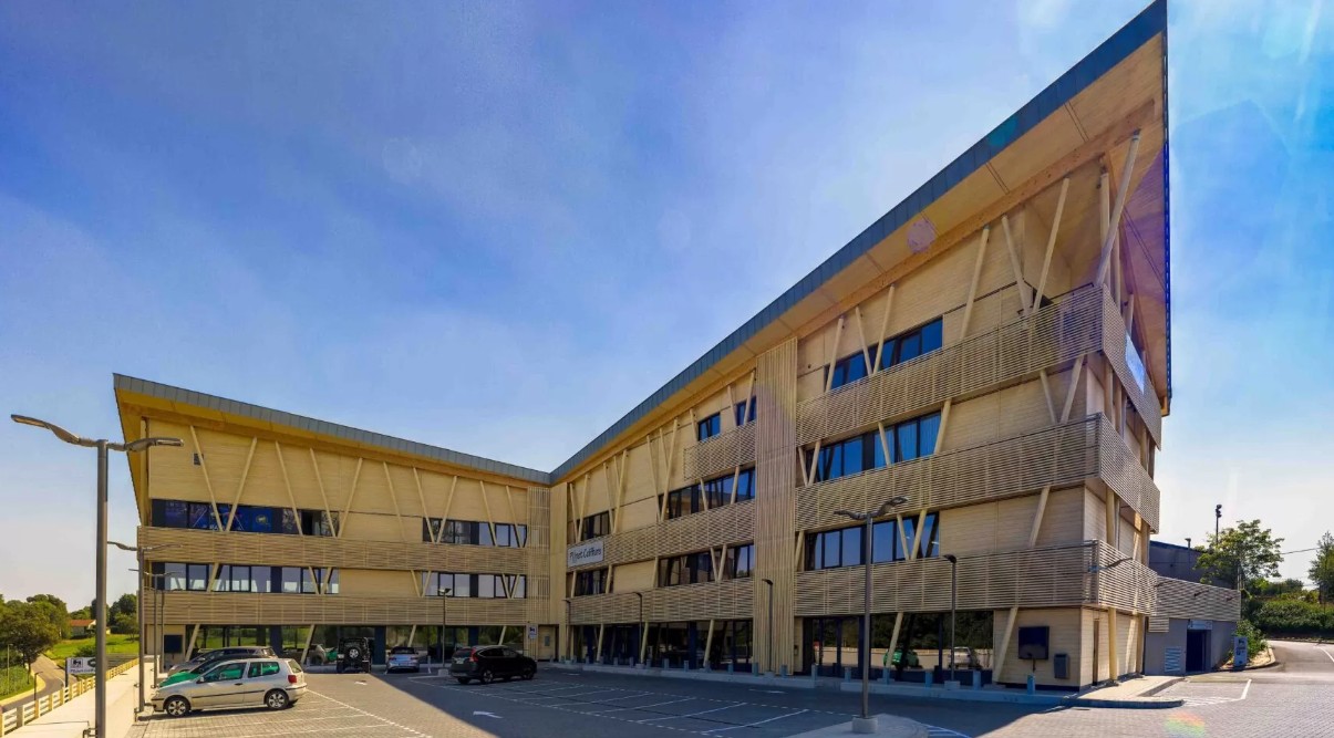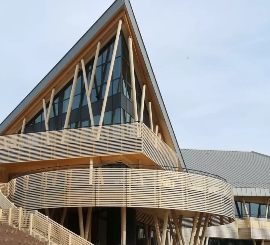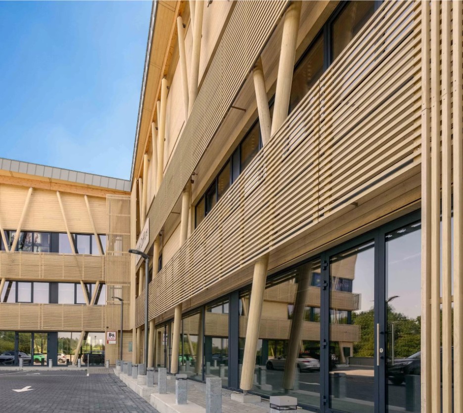 Opvallend binnen het geheel zijn de ronde kolommen die de structuur van het gebouw ondersteunen. Deze zijn vervaardigd uit gevingerlast gelamineerde Accoya balken, die nadien rond zijn geslepen.