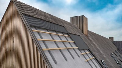 Het hout van de dakafwerking loopt mooi door op de gevel, daar zijn de latten wel op de traditionele manier bevestigd. Opvallend is de perfect aansluitende overgang tussen dak en gevel. Alles werd immers in het werk gesteld om de strakke lijnen van het gebouw niet te doorbreken.
