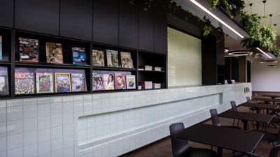 De bibliotheek van As is een echt trefpunt geworden. Het was een vereiste van de gemeente dat de toegang tot het gebouw laagdrempelig zou worden. Daarom kom je als eerste niet de boeken, maar wel een ontmoetingsruimte tegen. “De ruimte heet ‘De warme kamer’ en is gebaseerd op een dorpscafé. Een houten vloer, donker meubilair met tijdschriften en kranten, veel planten en een lange toog die fungeert als balie”, vertelt Dieter Van Loon, architect bij Architectuur Depot. De openingsuren van het gemeentehuis en de bibliotheekbalie vullen elkaar aan, zodat de bib ook toegankelijker wordt als informatiepunt.