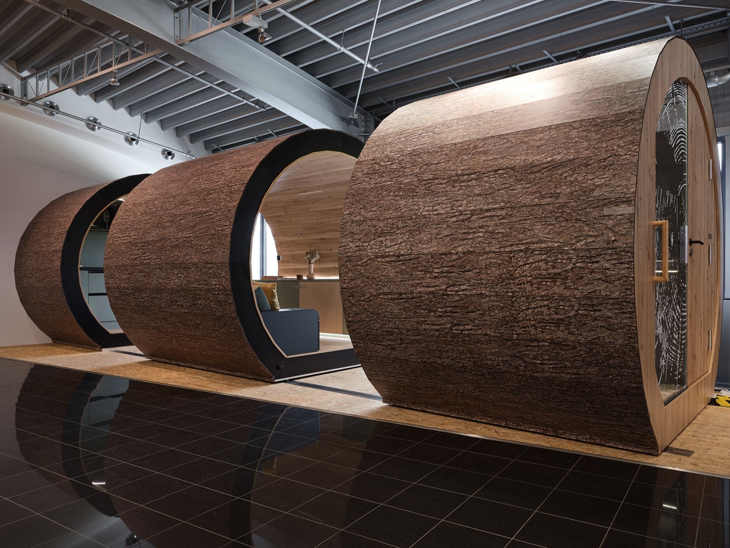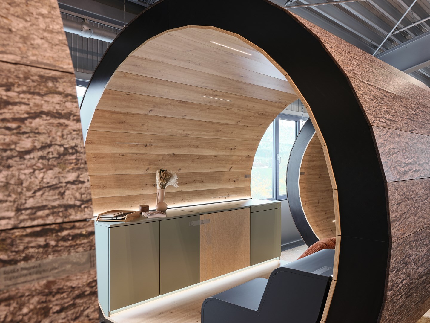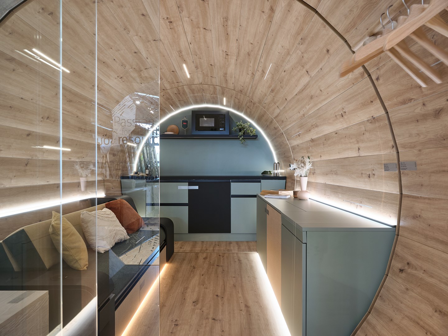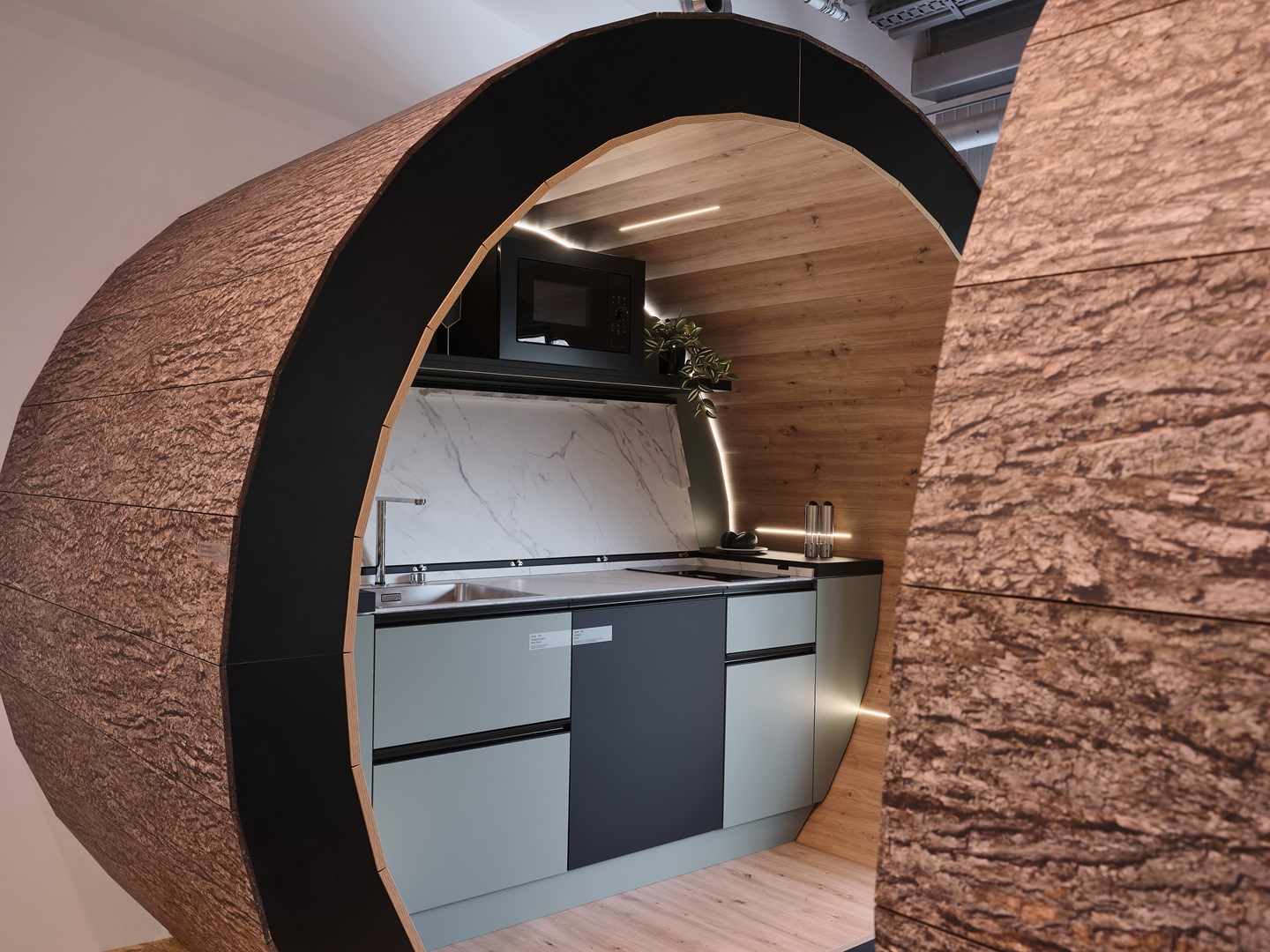 ‘Moving Tree’, gepresenteerd in het gerenoveerde Egger Forum in St. Johann (Tirol), is een innovatieve benadering van micro-wonen en circulair bouwen. Dit prototype werd ontwikkeld door Häfele, een toonaangevende leverancier van meubelbeslag en architecturale oplossingen, en houtspecialist Egger. Geïnspireerd door de natuur, is het ontwerp gebaseerd op een overmaatse, bewoonbare boomstam. Dit compacte micro-appartement van 15 m² is onderverdeeld in drie functionele zones: een entree met badkamer, een multifunctionele leefruimte die kan worden getransformeerd in een werk-, eet- of slaapruimte, en een achtergedeelte dat dienstdoet als keuken en opslagruimte.