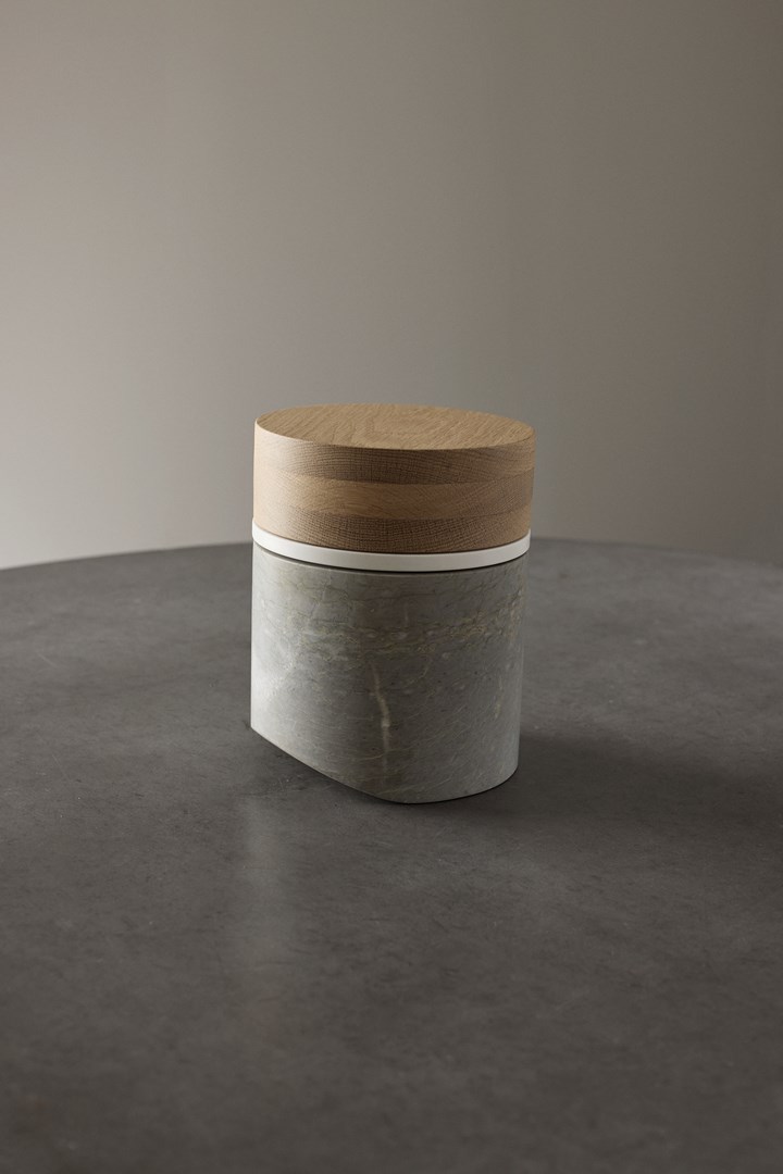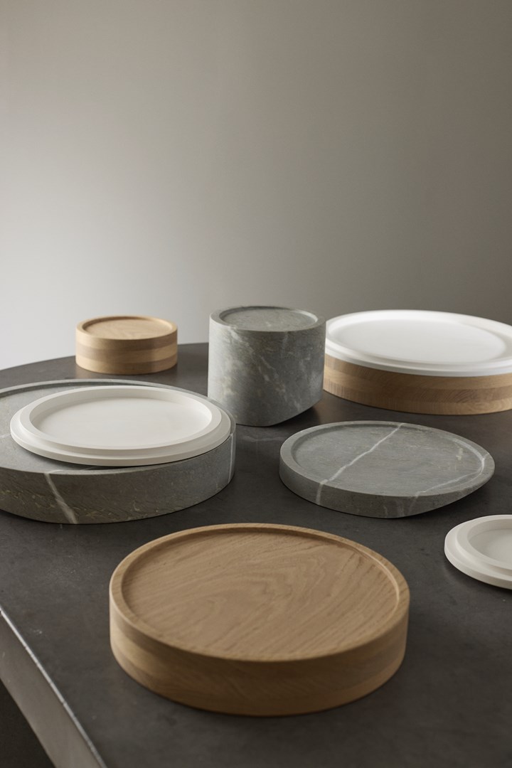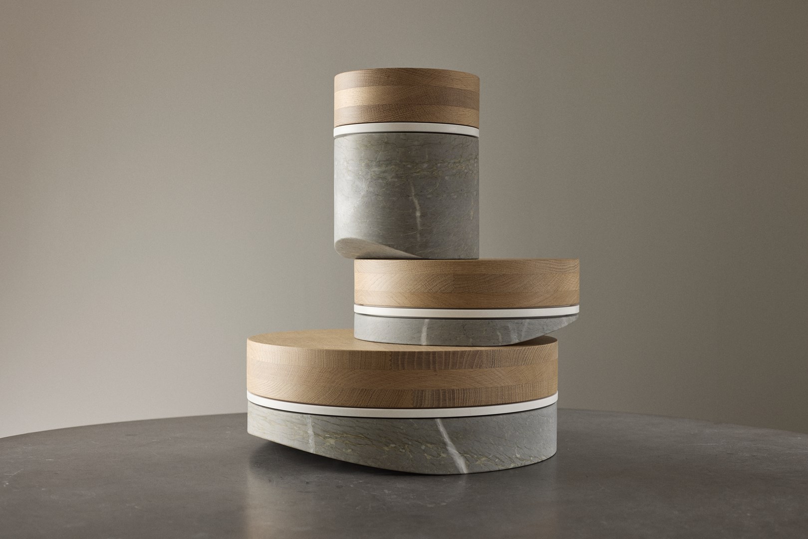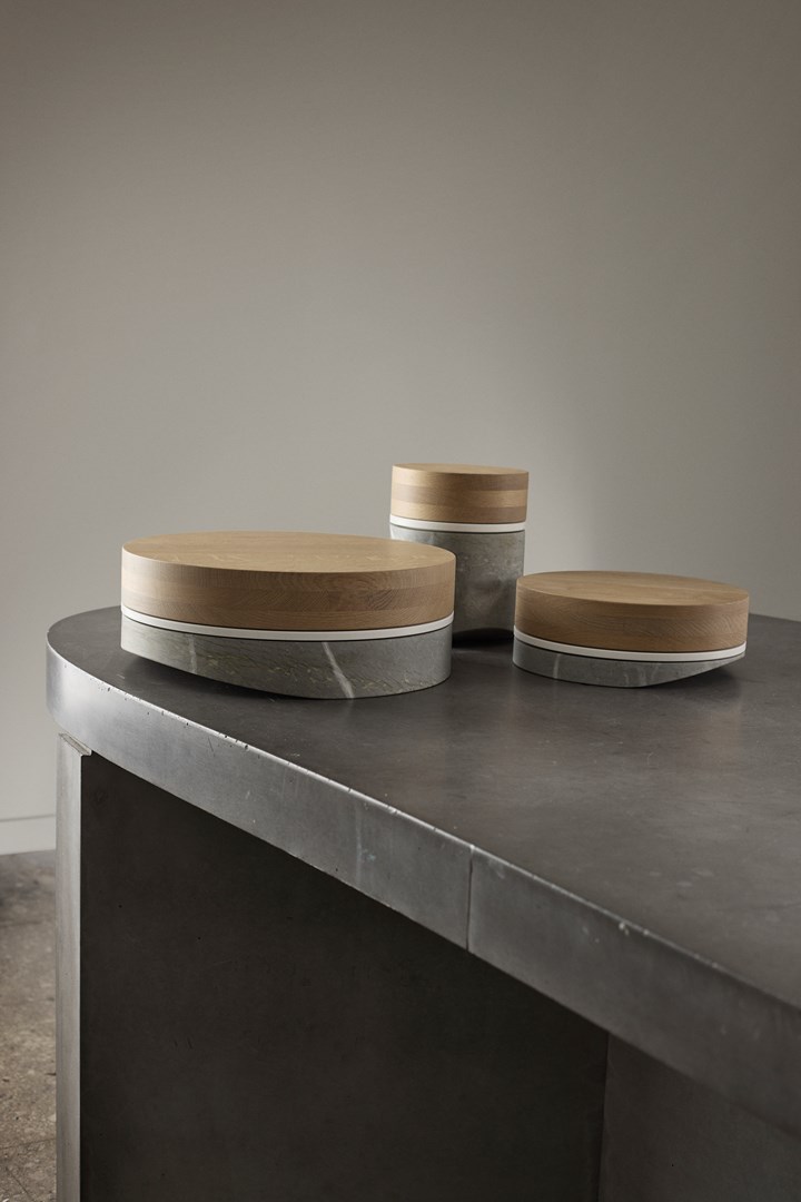 - mcrn – drie ronde schalen die samen één geheel vormen (marmer - vast oppervlaktemateriaal - blanke eik, 17/27/37cm diameter x 21/9.5/13cm H)