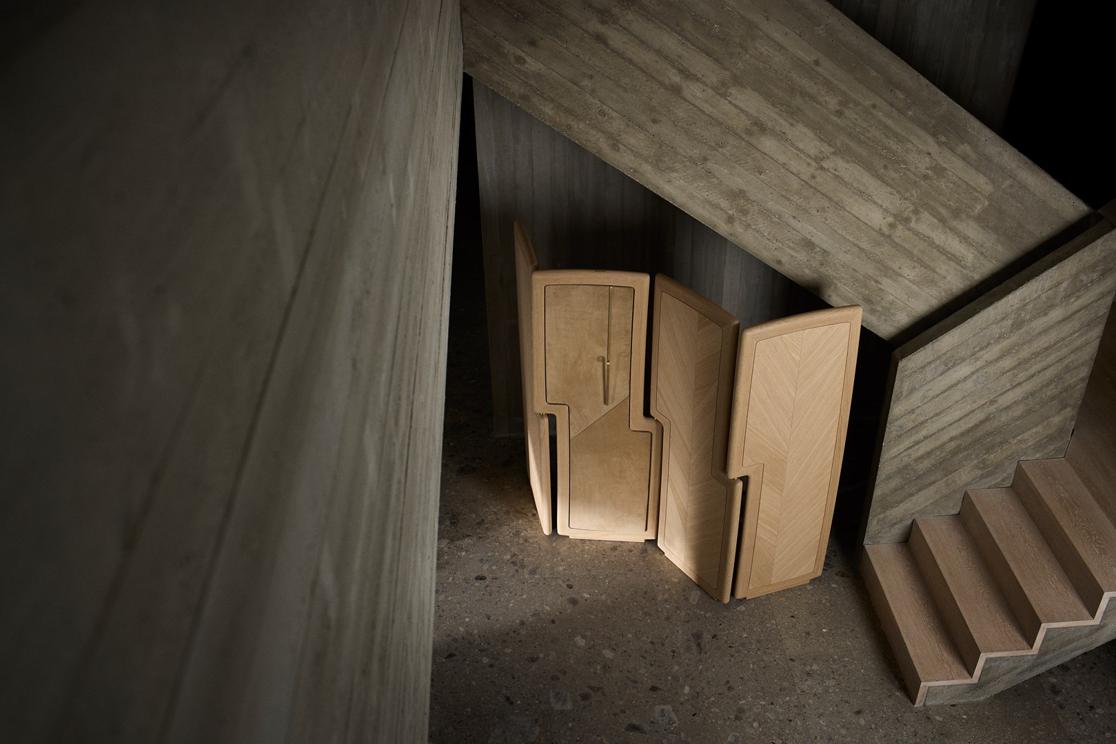 Zo is er ‘chll’, een eenzit voor binnen en buiten waarvan je de hellingsgraad van de zitting zelf kan kiezen door een langwerpig uitneembaar element uit de zijkant van de stoel te nemen en daarna achteraan in een uitsparing in het design te schroeven. ‘hdsk’ is dan weer een paravent waaraan je dankzij de toevoeging van een mooie afgeronde messinghaak kleding kan ophangen zonder die te beschadigen. Het object heeft daardoor ook iets weg van een opbergkast. Bij de bijzettafel ‘srvm’ hoort een dienblad. Via een magneet verbind je beiden met elkaar of haal je de delen uit elkaar.