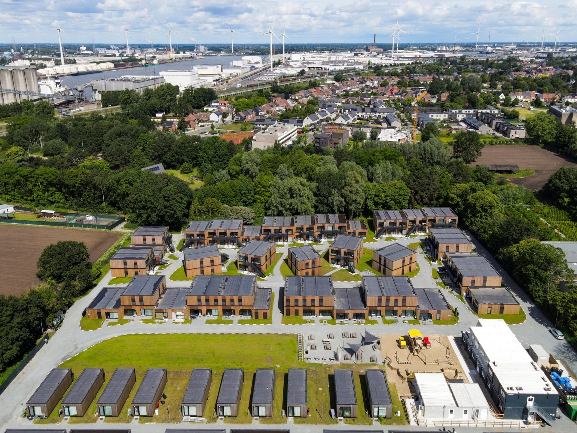 Nadat alle Oekraïense projecten in één klap van tafel waren geveegd, werd de richting van de samenwerking onmiddellijk omgedraaid en bood UAU Collectiv een helpende hand aan hun Oekraïense collega’s door Archimatika uit te nodigen om deel te nemen aan projecten in België. Ondanks alle moeilijkheden die de situatie met zich meebracht, slaagden beide architectenbureaus erin de samenwerking te intensiveren en verschillende projecten in Europa af te ronden. “Een daarvan is het onlangs geopende nooddorp in Gent,” vertelt Arsenii. “Met de hulp van onze Oekraïense partners en binnen het beperkte budget voor dergelijke projecten wisten we een modern ogend, gemeenschapsgericht dorp te bouwen, waar mensen zich thuis kunnen voelen terwijl ze zich ver van hun land en familie bevinden.”