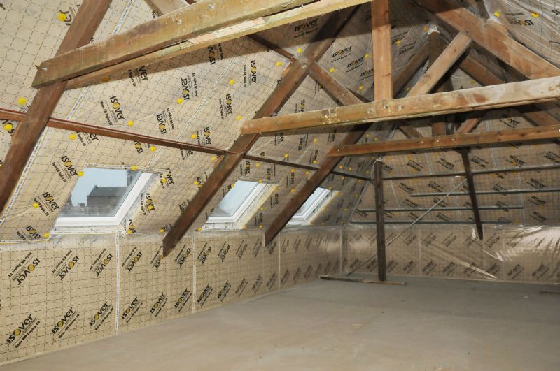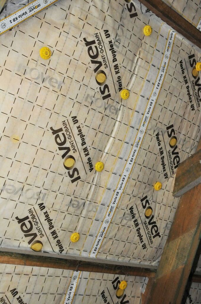 "Om hellende daken te isoleren werk ik al jaren met Isover", zegt Wim Rogge. "De Isoconfort-platen kan je makkelijk op maat snijden en laten toe om de kleinste hoekjes op te vullen met isolatie. Snel en efficiënt dus. Maar nog sneller en efficiënter als je Isoconfort aanbrengt met de de Suspente PlaGyp I-ophangstangen. Ze zien eruit als gele stompe pijlen met aan het uiteinde een rondelle en een dop die er vervolgens op geklikt wordt. Je moet eerst de Suspentes op de dakstructuur schroeven, dan klem je de eerste isolatielaag tussen de kepers en spies je de tweede isolatielaag over de stangen, je klikt de gele rondelles erop vast, prikt het dampscherm erover, sluit af met de gele dop en werkt het luchtdicht af met tape en mastiek. Op de gele doppen kan je Gyproc PlaGyp-plafondprofielen klemmen en op die plafondprofielen kan je dan de Gyproc-platen plaatsen. Elektrische leidingen komen terecht in de ruimte tussen het dampscherm en de gipsplaat."
