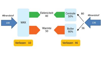 Een microwarmtekrachtinstallatie vervangt in eerste instantie een klassieke verwarmingsketel. De installatie is in staat om de nodige warmte te leveren maar bijkomend wekt ze ook elektriciteit op voor het huishouden. Dit zorgt ervoor dat de gebruikte brandstof efficiënter benut wordt dan in de situatie met een stookketel waarbij de elektriciteit in een centrale wordt opgewekt. Op deze manier wordt er een primaire-energiebesparing gerealiseerd zoals te zien is in het voorbeeld van figuur 1. Hoe groot de besparing precies is, hangt af van de gebruikte technologie binnenin de micro-WKK en het huishouden waar ze geplaatst wordt.