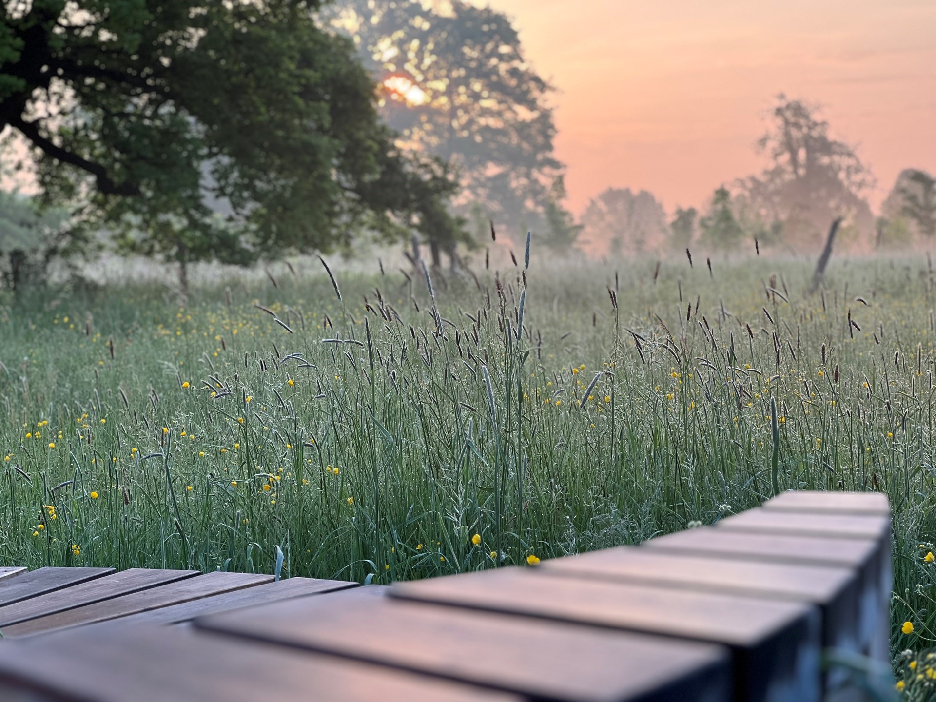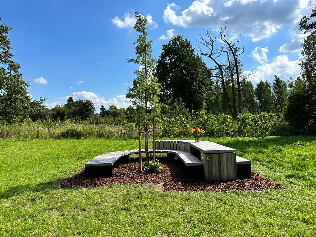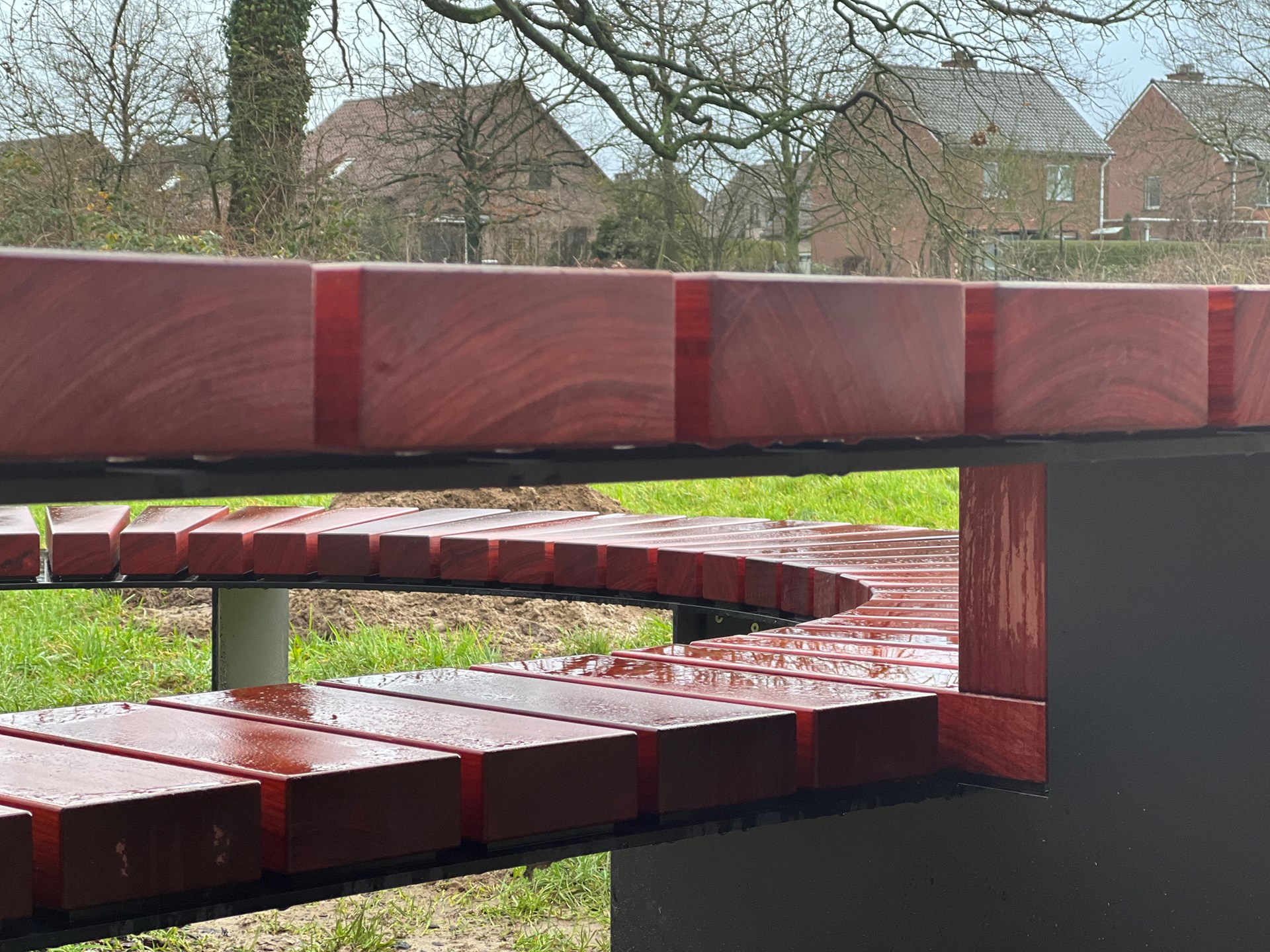 Ook voor de keuze van het materiaal voor de zitbank liet Gregory zich inspireren door wie Julie was: een echte scout in hart en nieren, een dame die nergens liever was dan buiten, in de natuur. Zo koos hij voor dikke blokken hout op metalen steunen. De balken zijn bovendien conisch geplaatst, als ‘zonnestralen’ rond het centrum van de boom en refererend naar het zinnetje dat mee werd vereeuwigd in Julies logo: “Jij bent de zon nu”.