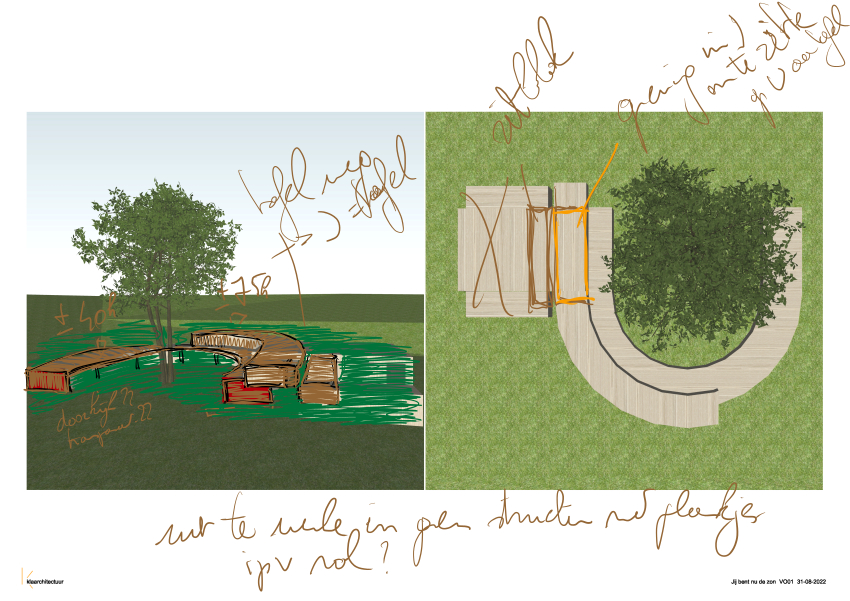 Nadat Geert en Guy hun idee besproken hadden met architect Gregory Nijs, vriend van de familie en zaakvoerder van ontwerpbureau Klaarchitectuur, zette die laatste zich aan de tekentafel. Aanvankelijk vertrok Gregory van het beeld van ‘de zon’. Die tekende Julie vaak. En werd na haar overlijden ook verwerkt in een speciaal kenteken voor de scoutsgroep waar ze Jin-leidster was.