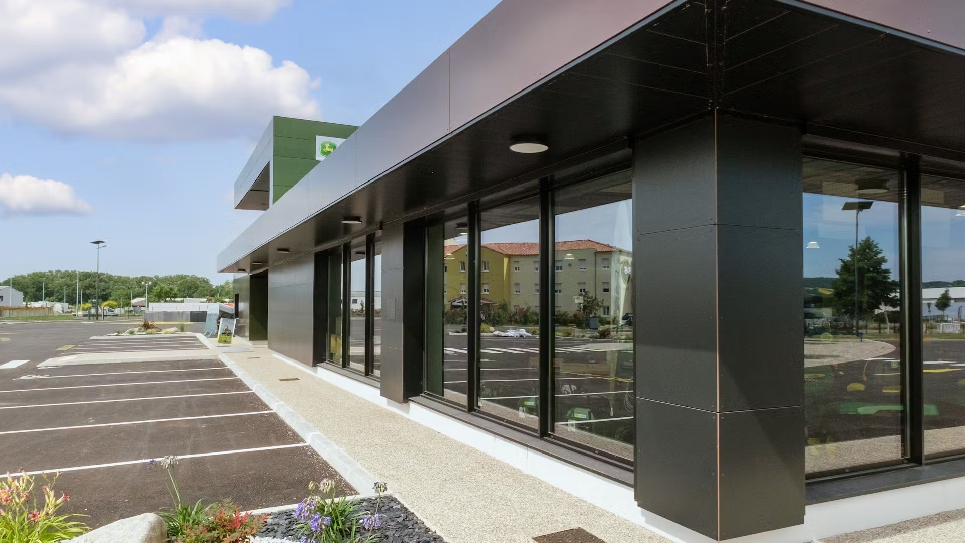 Een van de laatste projecten, de bouw van de John Deere dealer voor landbouwmachines van Établissements Tonon in Castelculier (47), zet Rockpanel gevelpanelen in de kijker. Voor Daniel Gamba is dit niet de eerste keer dat hij Rockpanel gebruikt, omdat ze in bijna al zijn projecten zijn verwerkt: "Voor mij hebben ze alle kwaliteiten. Ze zijn gemaakt van een natuurlijk materiaal, basalt, waardoor ze erg duurzaam zijn; de fabrikant legde uit dat ze een levensduur van meer dan 50 jaar hebben. Ze hebben bijna geen onderhoud nodig en als het nodig is, kunnen ze gemakkelijk worden gewassen". Een ander voordeel is dat de panelen 100% recyclebaar zijn, uiteraard aan het einde van hun levensduur, maar ook voor al het bouwafval. Al het bouwafval werd dus gerecupereerd om opnieuw in de productiecyclus te worden gebracht.