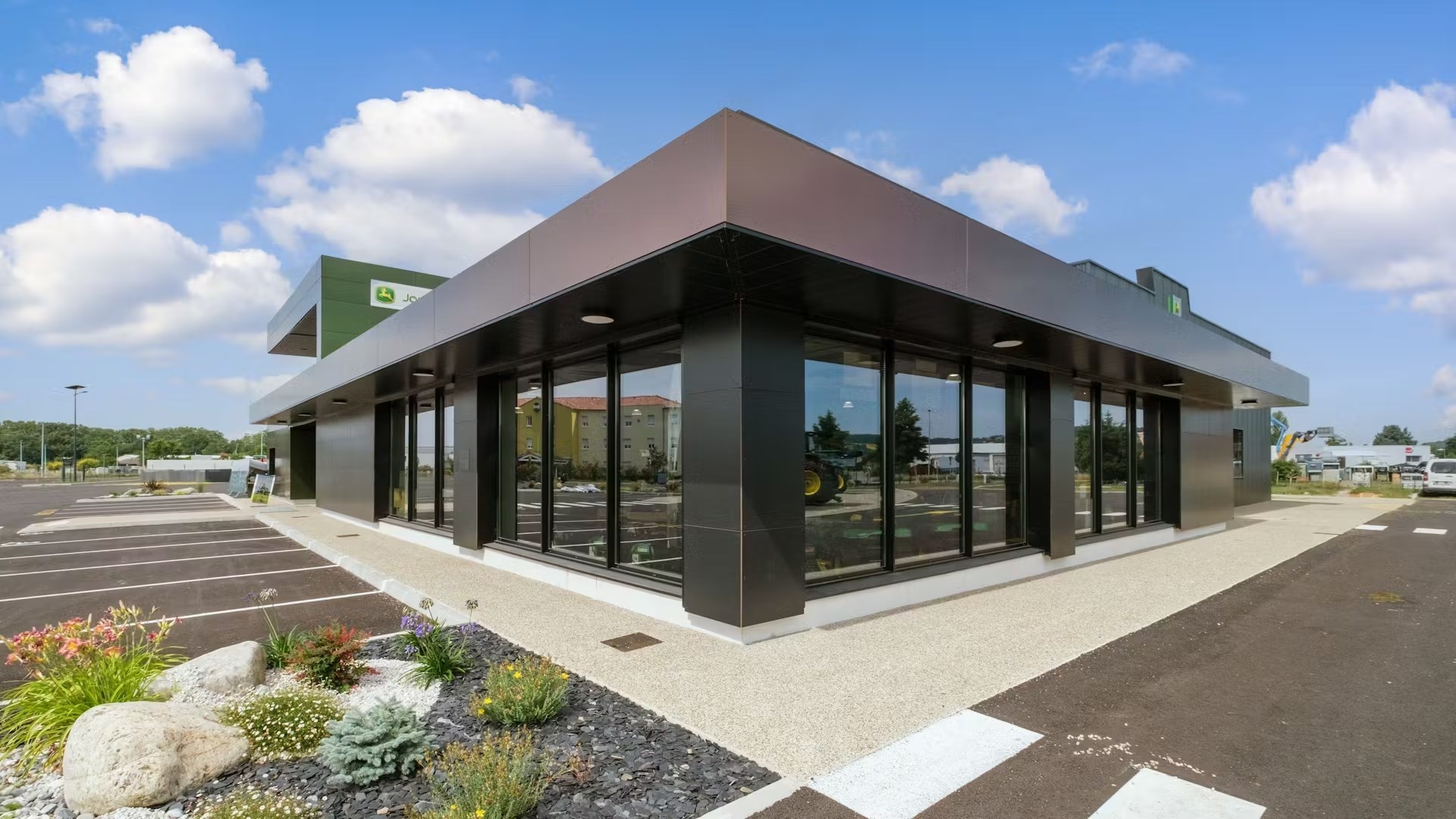 Net zo belangrijk voor de projectmanager en eigenaar is het installatiegemak en de ontwerpvrijheid. Commerciële dealers, waaronder die van landbouwmachines, worden steeds geavanceerder op het gebied van architectonisch ontwerp en esthetiek. Rockpanel gevelbekleding draagt hier aanzienlijk aan bij. Hier zijn ze toegepast op een klassiek gebouw met een metalen frame dat typisch is voor gevelbekledingsplatformen. Ze bedekken alle gevels, werkplaatsen en kantoren: "Zodra de lay-out is bepaald, is de installatie van de panelen op de metalen structuur eenvoudig en snel", legt Daniel Gamba uit.