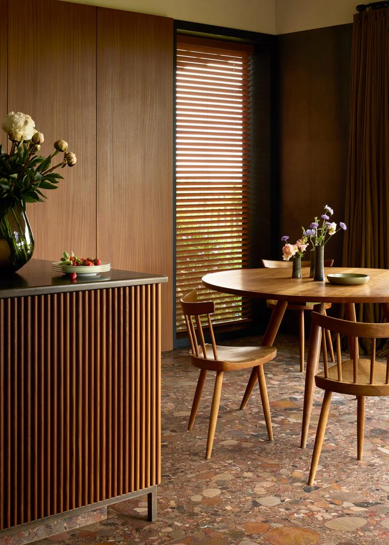 De organisatie van de woning vertrekt vanuit een uitgesproken aandacht voor circulatie en ruimtelijke samenhang. Lange gangen werden vermeden ten voordele van open zichtlijnen en een natuurlijke flow tussen de verschillende functies. Keuken en leefruimte lopen in elkaar over zonder fysieke scheiding, maar behouden elk hun eigen sfeer door subtiele verschillen in schaal en materialiteit. Die zorgvuldige afstemming van proporties resulteert in een interieur dat rust en vanzelfsprekendheid uitstraalt.