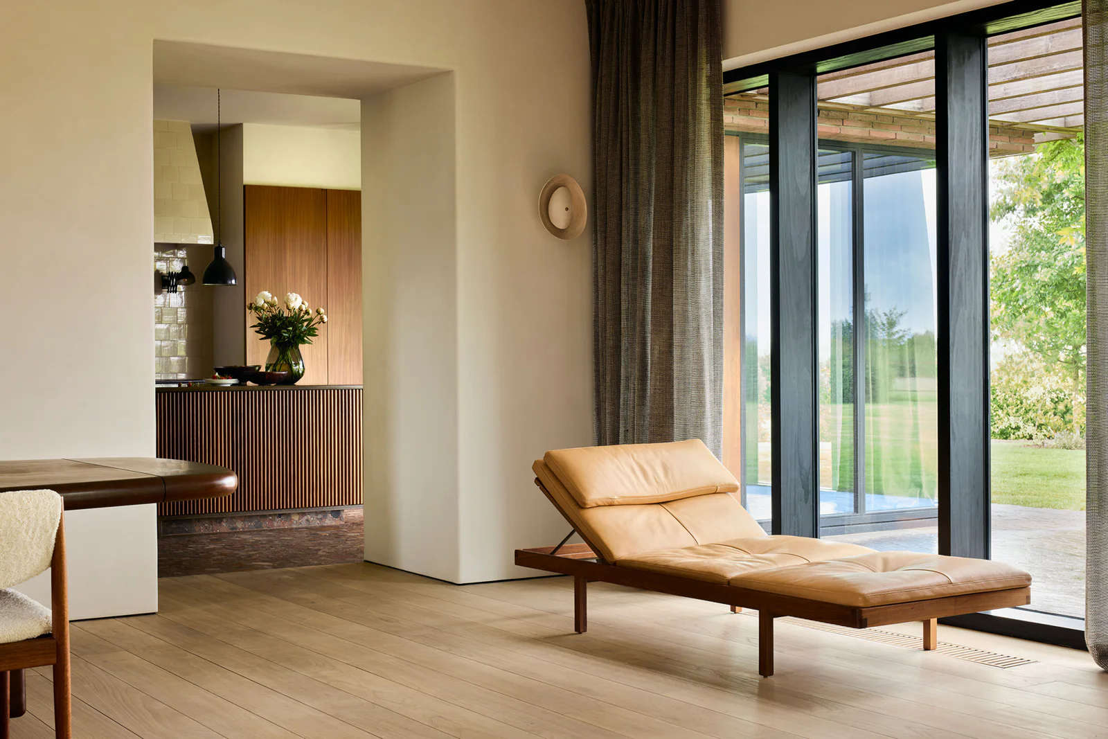 Vanaf de eerste schetsen werd elke ruimte gepositioneerd in functie van het uitzicht op tuin en landschap. Grote openingen kaderen telkens een ander fragment van de omgeving, waardoor het huis als het ware meedraait met zijn context. Ook aan de buitenzijde sluit de architectuur aan bij die benadering: de combinatie van baksteen en houten schrijnwerk, geïnspireerd op Deense voorbeelden uit Kopenhagen, zorgt voor een ingetogen en tijdloze uitstraling die mooi veroudert in het Vlaamse landschap.