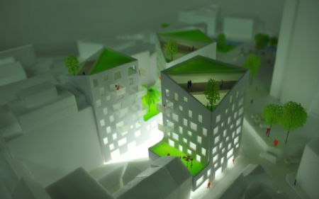 Een grote publieke ruimte in combinatie met een monumentale toegang tot het gebouw voorziet het architectenbureau door vier verdiepingen van de hoektoren te snijden. De drie torens krijgen in dit ontwerp bovenaan verder ook een afsnijding langs de bovenste twee verdiepingen, waardoor grote open terrassen ontstaan die gericht zijn op het zuiden en mooie stadsgezichten opleveren. De andere appartementen hebben balkons die aan de gevel hangen en zijn zo geplaatst dat ze de privacy van de andere bewoners garanderen, wat het geheel bovendien een speels karakter geeft.