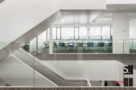 Het kantoor is verder opgebouwd uit twee bouwlagen met een dakverdieping. Het gebouw bestaat uit twee kantoorzones die geknikt tegenover elkaar staan. De dubbelhoge zone tussen beide volumes huisvest de ingang en de lobby met een passerelle. De kantoorzones situeren zich aan de gevels (in functie van het zicht, licht en lucht), in de middenzones zijn de vaste kernen, formele en informele ontmoetingsruimtes, vides en interne verticale circulatie. Vides en daklichten zorgen tegelijkertijd voor mogelijkheden van nachtventilatie en het binnenbrengen van natuurlijk licht midden in het gebouw. De derde bouwlaag is ontworpen als een penthouse en huisvest een polyvalente zaal met terras. Bij de uitwerking van het architecturaal concept streefden de ontwerpers naar een evenwicht tussen transparantie en privacy, met respect voor auditief comfort. Aparte werkcellen worden afgewisseld met clusters voor kleine groepen en grotere landschapskantoren.