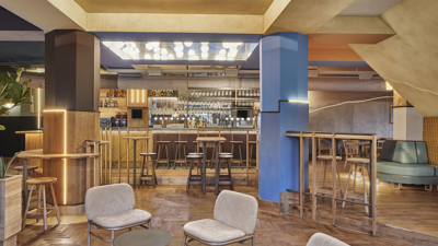Lichtstralen aan de ene kant en lichtbogen aan de andere kant, omarmen een kleine houten bar en speelse hoge zitplaatsen, waardoor er een intieme hoek ontstaat. Op een paar stappen van de kleine bar domineren warme kleuren en zachtere lijnen. De tegelvloer is bedekt met een zacht vloerkleed en de houten lamellen van de muur zijn bedekt door een fluwelen goudkleurig gordijn. Een ideale plek om te ontspannen op de rode fluwelen loungezetels.