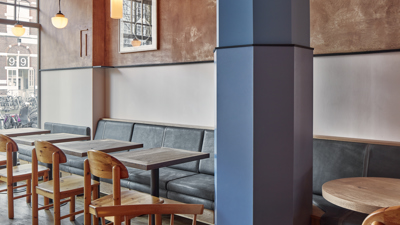 Terwijl de bar zich om de hoek wikkelt, verandert hij van niveau waar een speelse zitplaats op maat van de klanten leidt naar een van de eetgelegenheden. Hier zijn de kleuren dramatischer waardoor er een mysterieuze sfeer ontstaat: het glanzende plafond, de diepblauwe zuil en de stucwerkmuren herinneren aan de reflecties van het water en de ruwheid van de delta's van een moeras. Een gelijkaardige sfeer verschijnt opnieuw aan de andere kant van de zaal, met een uitzicht op het plein, waar een donkerpaars plafond en een op maat gemaakte gebogen bankje een hoek creëren met de aangrenzende zuil Hierdoor wordt de bar gescheiden van de eetruimte.