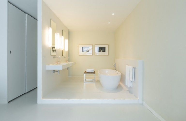 In de badkamers opteerde Jan Bakers Architecten voor crèmekleurige tegels uit de serie Terra Maestricht. “We kozen voor een lichte, duurzame badkamer die niet te tendentieus is”, vertelt Jan Bakers. “De crèmekleur van de Terra Maestricht-tegel is tijdloos en maakt dat de badkamers er over tien jaar nog steeds zeer stijlvol zullen uitzien.” De Mosa-tegels zijn zowel voor de vloeren als de wanden gebruikt. Ze hebben dezelfde kleur en afmetingen, 15 x 45 centimeter, alleen zijn de vloertegels slipvast afgewerkt.