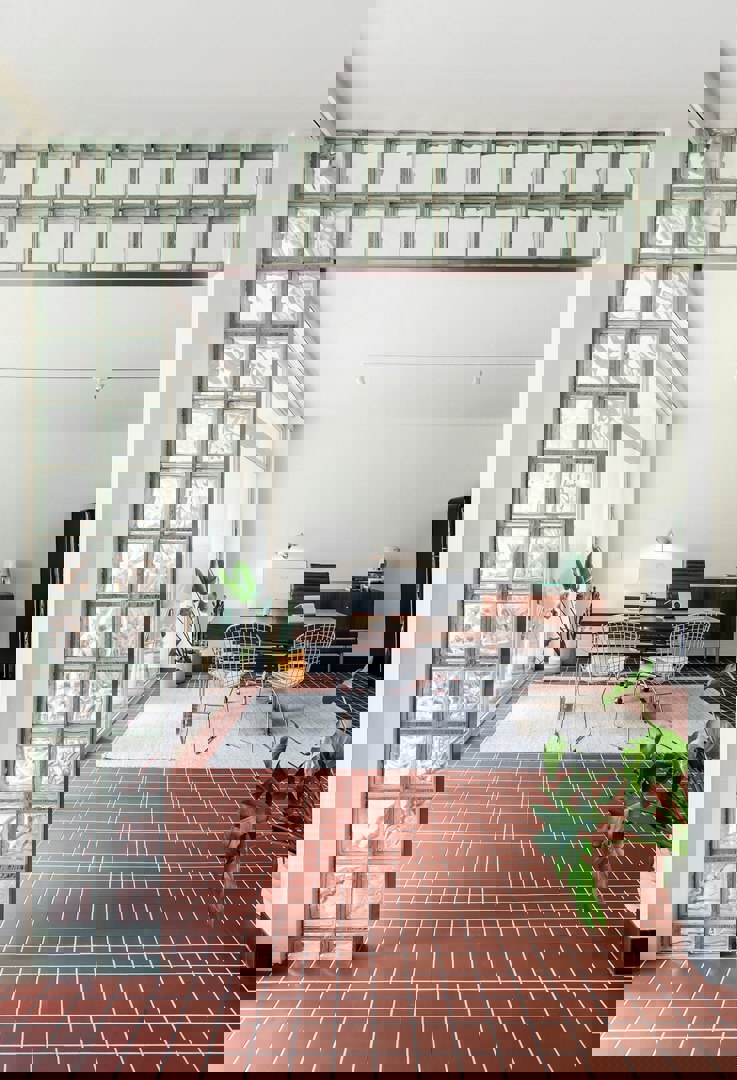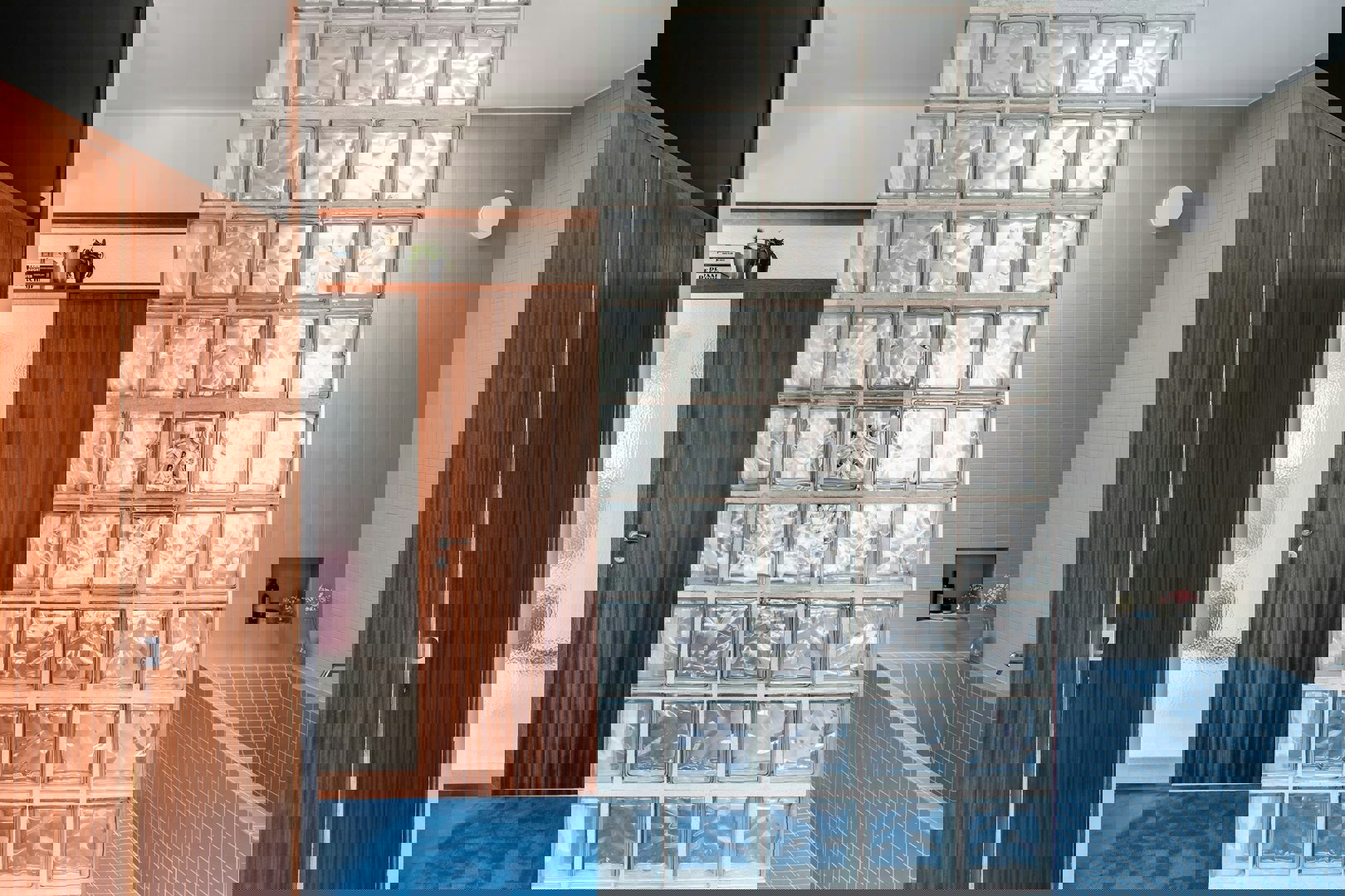 De ingreep van B-bis was eerder een verfijning dan een vernieuwing. De structuur en ruimtelijke indeling bleven onaangeroerd, en zelfs de oorspronkelijke inox keukenhandgrepen werden zorgvuldig hergebruikt. Nieuwe ingrepen, zoals maatmeubilair in bijpassend houtfineer, werden ontworpen in dialoog met de bestaande materialen en verhoudingen. Op plekken waar het plan nog ruimte liet, verschenen subtiele aanvullingen: een glasblokkenwand die aansluit op het ritme van de gevel en een ingebouwde zitbank die de overgang tussen de woonzones markeert.