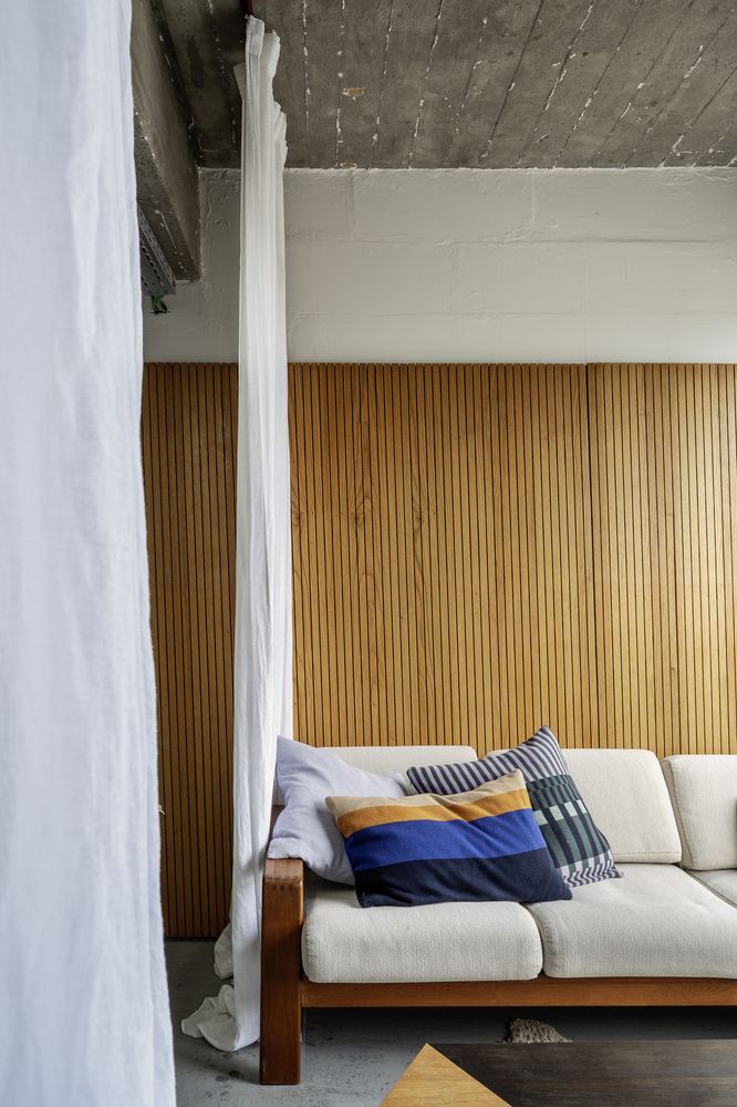 Naast de werk- en vergaderruimtes kreeg ook de ‘living’ een duidelijke eigen sfeer. Hier werd bewust gezocht naar rust en intimiteit, met tweedehands eiken akoestische panelen, een oude zetel en zelfgemaakte gordijnen. De materialen brengen warmte in de ruimte zonder het industriële karakter uit te wissen. Het resultaat is een plek waar overleg en pauze samenvallen, los van de dynamiek van het open kantoor.