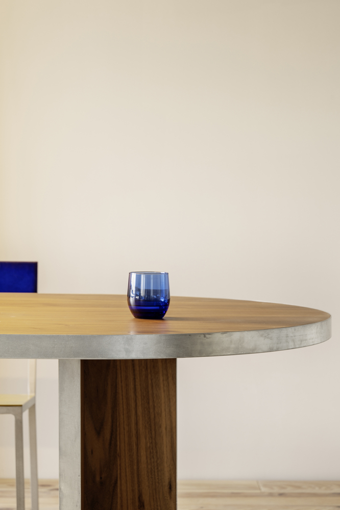 Ook andere ingrepen volgen diezelfde logica van zichtbaar hergebruik. Het betonnen plafond werd luchtgegomd, waardoor de oorspronkelijke textuur opnieuw leesbaar is. De kleuren in de vergaderzaal sluiten aan bij wat er al was: geel verwijst naar gasleidingen, groen naar elektriciteit. De vergadertafel is een ontwerp van tweestroom en werd uitgevoerd door Atelier Circuler van de Materialenbank, met hergebruikte notelaar afkomstig uit M Leuven en afgewerkt met aluminium. De vloer werd genivelleerd met houten planken die in het gebouw werden gevonden, wat tegelijk de akoestiek ten goede komt.
