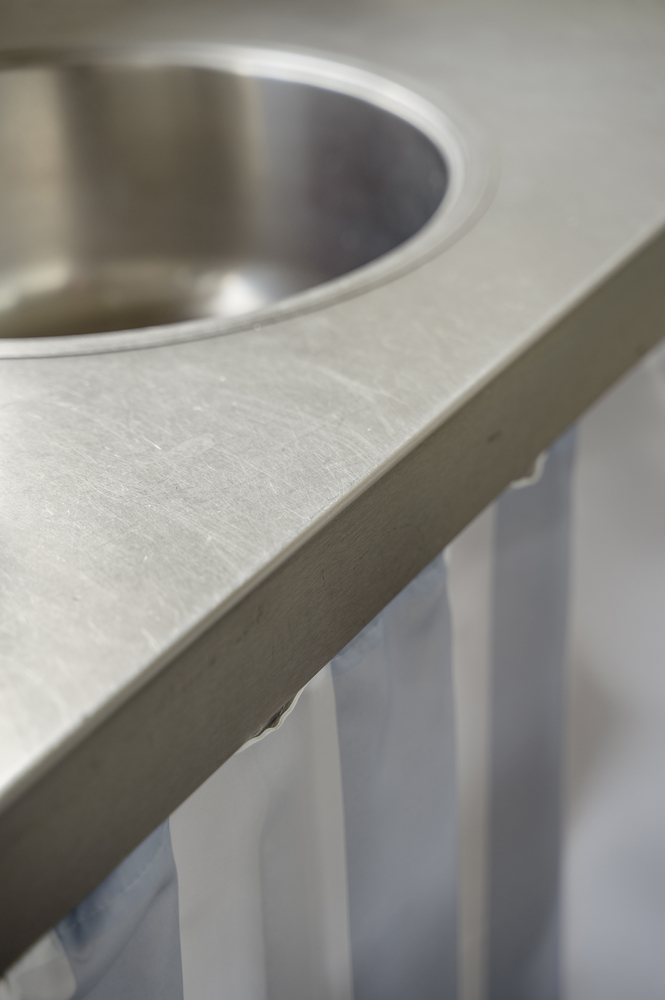 De keuken sluit daar vanzelfsprekend bij aan. Een tweedehands inox keukenblok bleek perfect te passen bij de ruwe aluminium accenten in de rest van het interieur. Ook hier zorgen gordijnen voor een speels en huiselijk tegengewicht. In de volledige werkplek spelen textiel en kleur een belangrijke rol om de harde materialen te verzachten, terwijl alles demonteerbaar en verplaatsbaar blijft. Marie Thumas toont zo hoe tijdelijk gebruik meer kan zijn dan een pragmatische oplossing. Door consequent te vertrekken van wat al aanwezig is, ontstaat een werkplek met een uitgesproken identiteit.