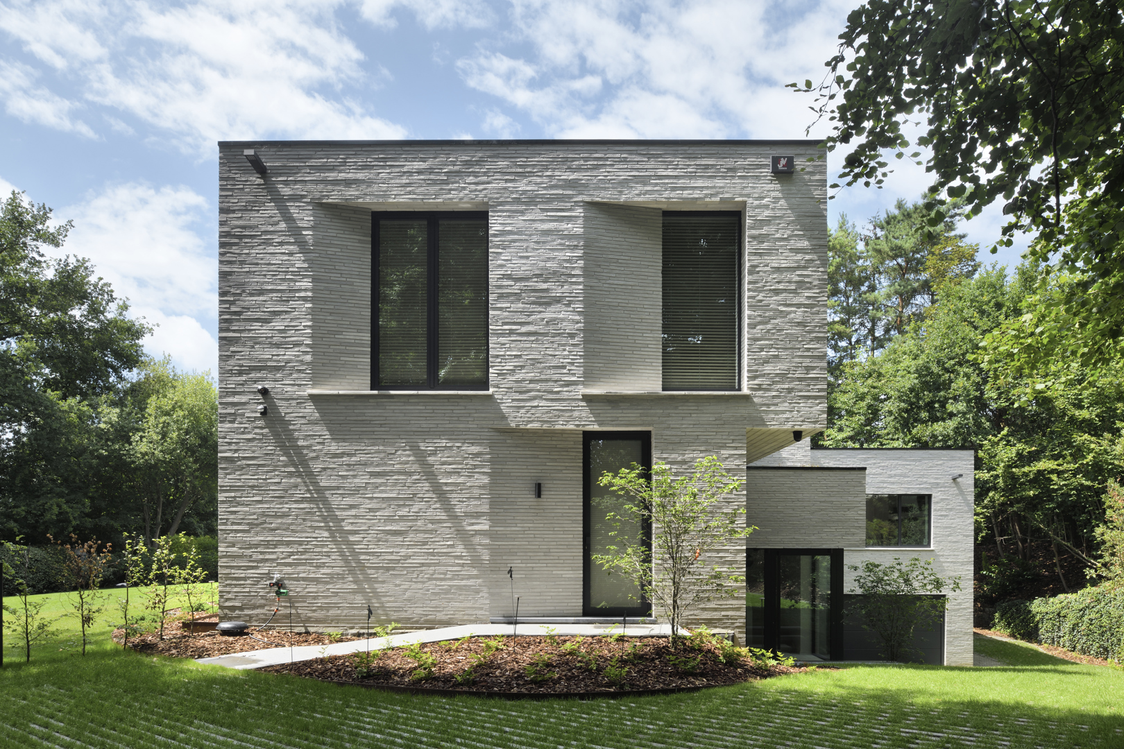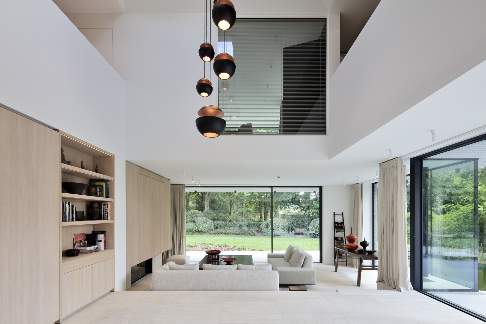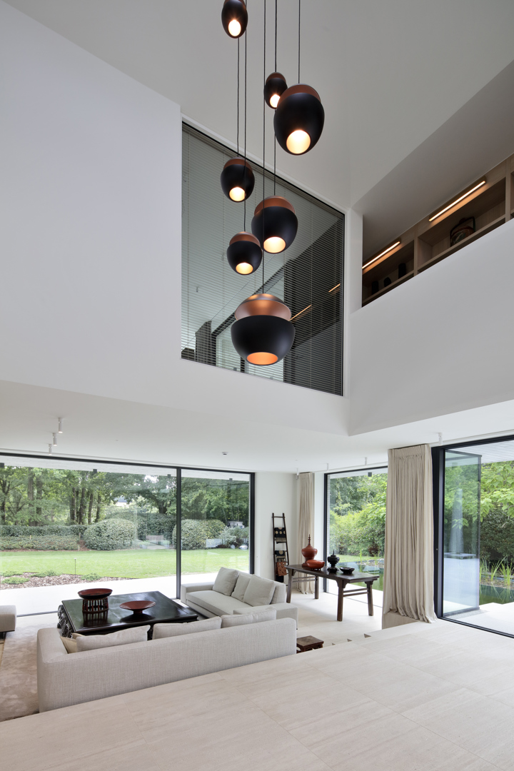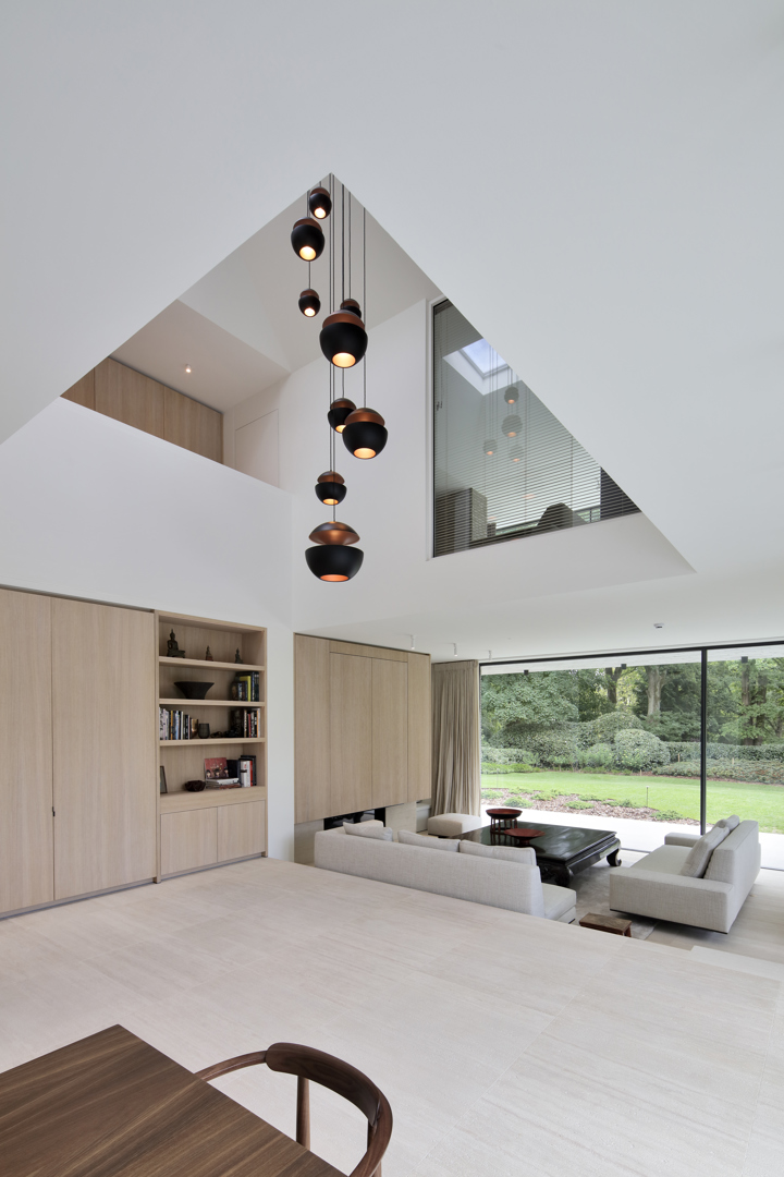 Ook de tuin werd ontworpen als verlengde van het architecturale concept. Het perceel wordt omzoomd door volwassen eiken en beuken, aangevuld met een beplanting die inheemse soorten combineert met subtiele Aziatische accenten zoals Japanse kornoeljes. De zwemvijver, het minimalistische tuinhuis en de padoek overkapping vervolledigen het ensemble. Zo ontstaat een woning waarin architectuur, interieur en landschap in één samenhangend verhaal worden gebracht.