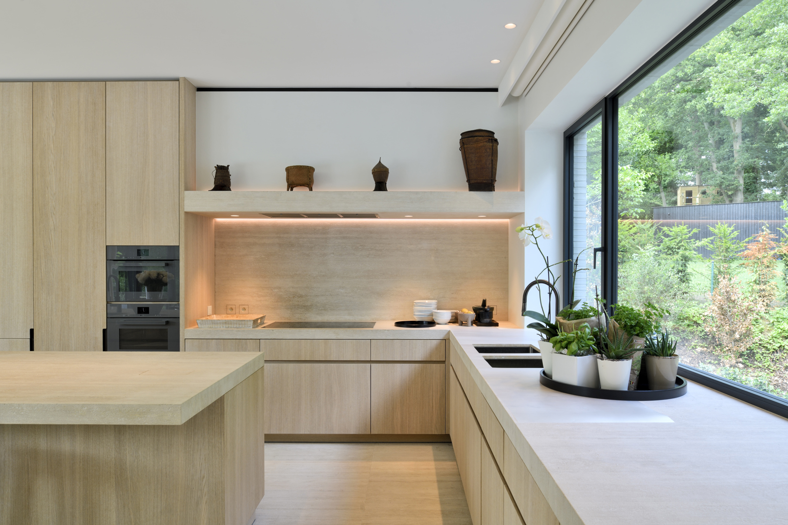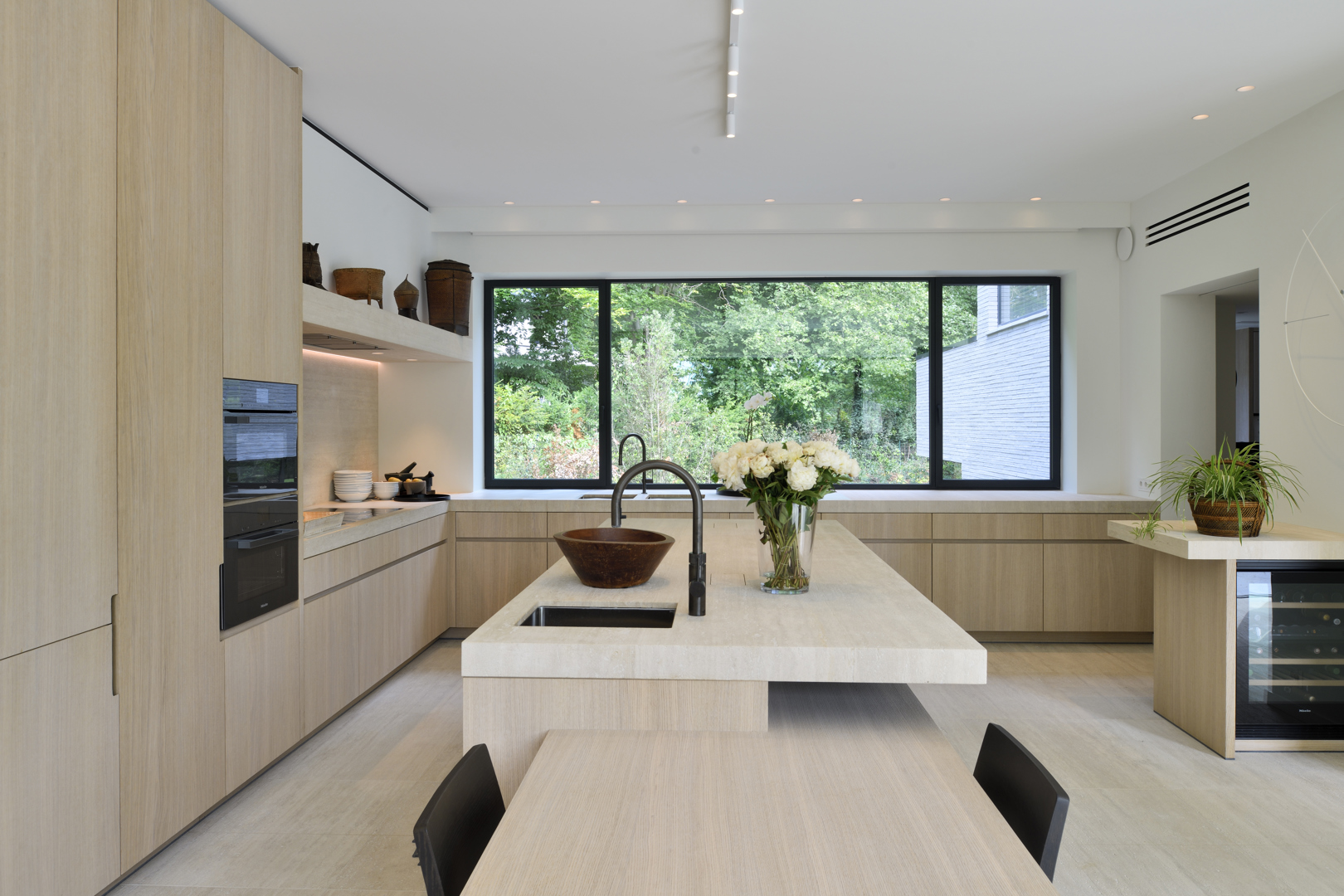 De maatwerkkasten spelen een sleutelrol in de ruimtelijke beleving. Met hun vlakke fronten en zwarte grepen vormen ze rustige wanden waarin nissen zijn uitgespaard voor zorgvuldig geselecteerde objecten. In de leefruimte loopt de travertijnvloer naadloos door naar de terrassen in graniet, die zorgvuldig zijn uitgelijnd, zodat binnen en buiten visueel in elkaar overvloeien. De keuken sluit hierbij aan met eikenhouten volumes, verfijnde detaillering en indirecte verlichting die het werkblad zacht accentueert.
