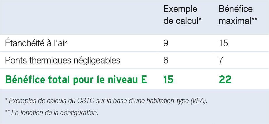 Unidek in plaats van het hanteren van de forfaitaire waarden, leidt dus tot een verlaging van het K- en E-peil. De winst kan naargelang de configuratie oplopen tot 10 K-punten en 7 E-punten. Berekeningen uitgevoerd door het WTCB op basis van een voorbeeldwoning van het Vlaams Energieagentschap (VEA) gaven al een winst van 7 K-punten en 6 E-punten.