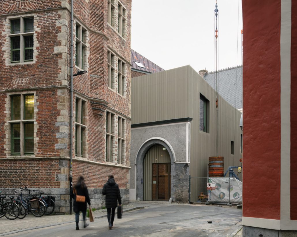 De bestaande achterbouw had geen historische waarde en werd volledig gesloopt om plaats te maken voor een nieuwbouwvolume. Dit nieuwe deel herbergt de ondersteunende functies en technieken, zoals een cafetaria, een fietsenberging en technische dienst, waardoor het hoofdvolume ontlast wordt. De ingreep maakt de historische achtergevel opnieuw zichtbaar en brengt lucht en zonlicht in het binnengebied. Verder heeft het project een kleine binnentuin, een groendak en een dakterras met uitzicht op de Sint-Baafskerk en de Achtersikkel.
