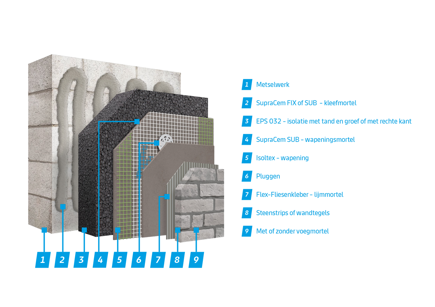 De steenstrips, vervaardigd uit klei (NBN B 23-004) of keramiek (NBN EN 14411), worden verlijmd op een stabiele ondergrond van EPS-isolatie met een wapeningslaag in lijmmortel en glasvezelnet. Nadien zorgt een voegmortel, beschikbaar in verschillende tinten, voor de definitieve afwerking. Het resultaat is een duurzame en slagvaste buitenschil die esthetiek koppelt aan thermische performantie.