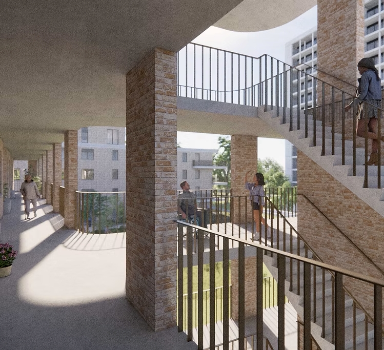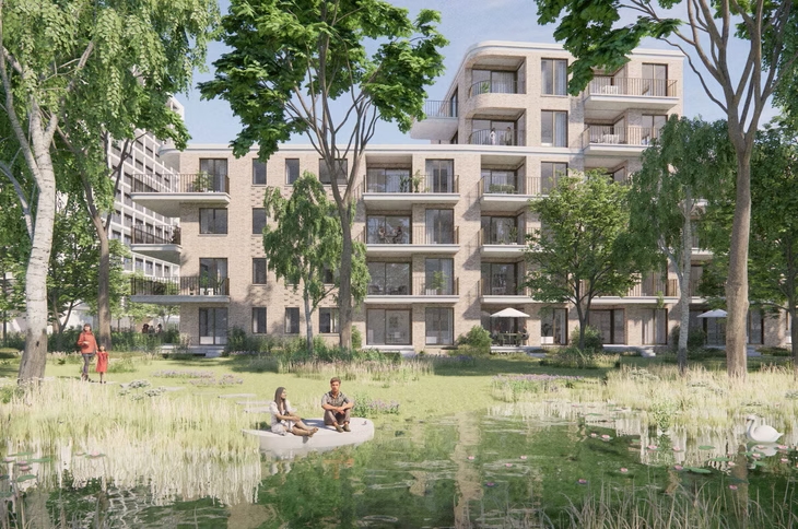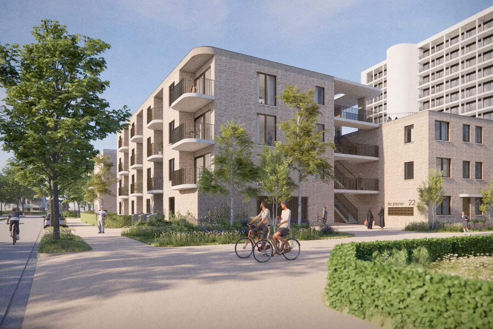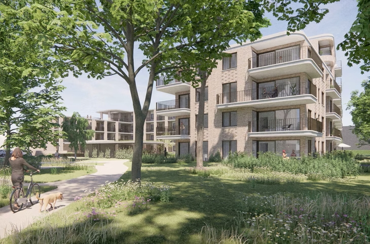 De nieuwe woonblokken zijn zo gepositioneerd dat ze maximale ruimte vrijwaren voor de Leiselebeek en het omliggende groen. Daardoor ontstaat een compacte, leesbare figuur met een helder netwerk van doorsteken en een groene ontmoetingsruimte als kloppend hart van het project. In de architectuur kiest KRAS voor warme materialen, afgeronde hoeken en sterke repetitie. Dat levert een rustgevend en tijdloos ensemble op waarin sociale en private woningen één samenhangend geheel vormen, met licht, lucht en water als leidende kwaliteiten.