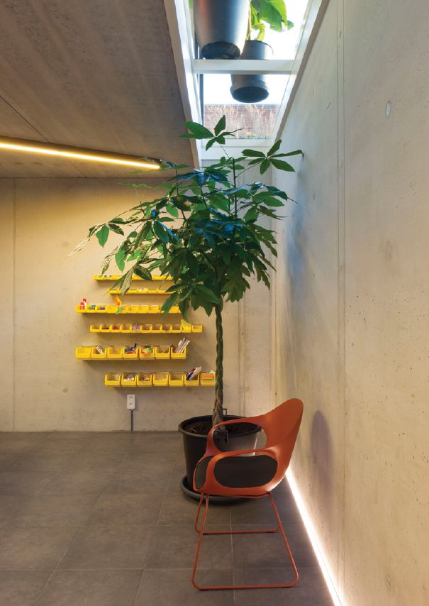 Deze laatste ruimte bevindt zich achteraan de woning. Dankzij die ligging kan ze via een glazen plafond genieten van daglicht. Aanvankelijk waren ook andere mogelijkheden – zoals een talud met buitenraam – onderzocht om daglicht binnen te halen, maar de huidige oplossing houdt geen risico op lekken in en is bovendien onderhoudsvriendelijk. Bovendien geeft deze aanpak een mooi spel van scheerlicht langs de betonnen wanden. Het buitenschrijnwerk in de achtergevel loopt om de hoek over de breedte van het glazen plafond om de lichtinval te optimaliseren.