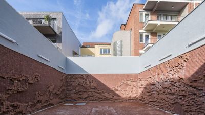 Het nieuwe gedeelte werd ingebed in het stedelijk weefsel in de vorm van een aaneenschakeling van binnen- en buitenkamers met elk een eigen materialiteit en sfeer. Op die manier werd ingespeeld op de grillige vorm van de bouwkavel en werd een repliek gegeven op het amalgama van tuinmuren en koterijen.