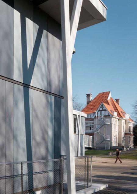 Een gigantische nieuwe zuilenorde van wit-grijze stalen kolommen, voor een scherm van gevelpanelen, laat een optimaal contact met het bospark toe. De gevel is volgens de architecten geïnspireerd door de muziek zelf. Het ritme van deze structuur komt overeen met 4m40 of 440 Hertz, de “la”, een grondtoon in de muziek. De panelen volgen een patroon van interferentie en boventonen. De gevel legt zo het verband tussen maatsystemen (beeld) en harmonie (muziek), volgens de Pythagoras hypothese die harmonieuze maten met akoestische performantie verbindt. Denk maar aan de lengte van snaren die de toonhoogte bepaalt.