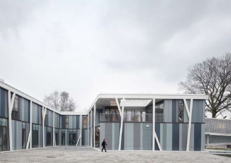 Het gevolg is een ver doorgedreven akoestisch comfort voor elk van de leslokalen. Het gebouw toont dat ook in zijn externe staalstructuur die de vloerplaat loskoppelt van de draagmuren, de akoestische plafonds die zich terugtrekken net voor ze de gevel raken, of in de absorberende materialen die aan elke klas werd toegevoegd als wandpaneel of gordijn. Tegenover die vraag naar akoestisch isolement staat een breed contact met de buitenomgeving en gebouw dat ook vaak naar zichzelf kijkt.