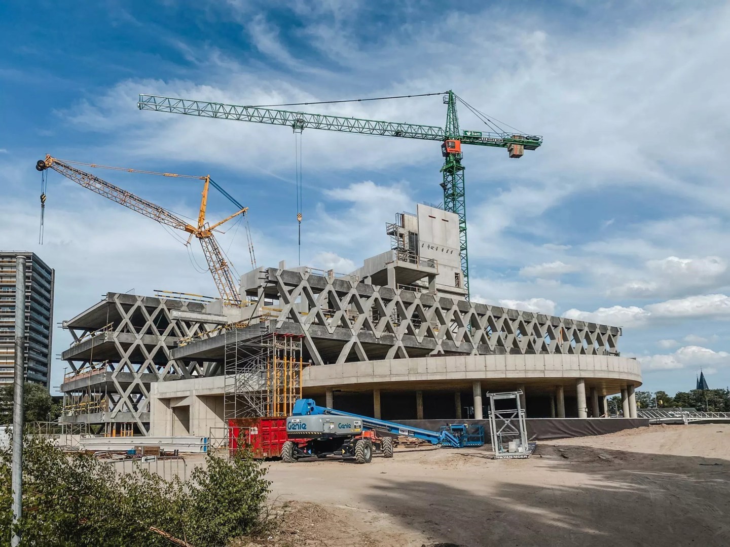Een nieuwe mijlpaal dus voor het project op de Eandistip. De expressieve constructie met gevels die volledig uit een kruisstructuur bestaan is zeker niet 100% circulair, maar wordt wel gerealiseerd volgens enkele principes van circulair bouwen. Zo werd de parkeertoren ontworpen als een zogenaamd intelligent casco, waardoor hij flexibel, polyvalent en aanpasbaar is. Het intelligente casco laat immers toe de bouwlagen op termijn een andere functie te geven.