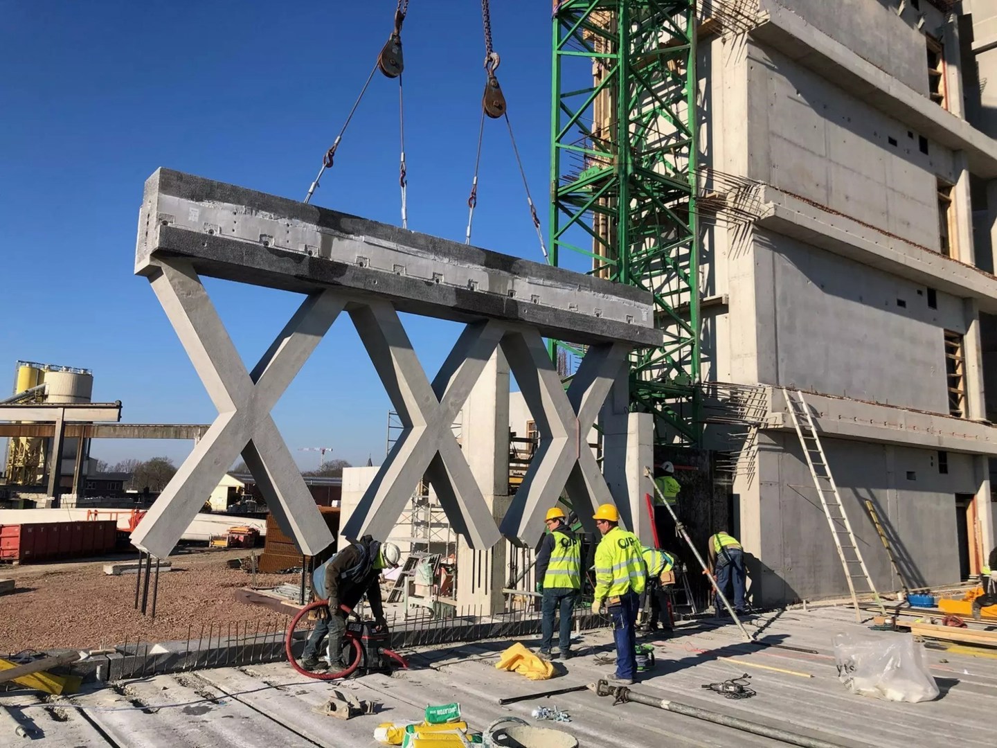 Maar Verheyen klaarde de klus dus vlekkeloos, mede door het feit doordat het in een vroeg stadium mee aan tafel ging zitten met het bouwteam, waardoor de elementen konden worden geoptimaliseerd. Het is ook in die gesprekken dat uiteindelijk werd beslist om te werken met prefabelementen en niet met ter plaatse gestort beton. Daarnaast werd besloten om in plaats van losse X-elementen, gecombineerde X’en met balken te creëren, goed voor een aanzienlijke vermindering in het aantal elementen en koppelingen, met een beduidend kortere doorlooptijd van de montage tot gevolg.
