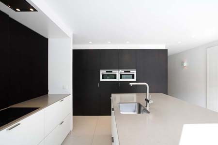 De circulatieruimte gaat over in het leefgedeelte. Deze circulatiezone wordt geaccentueerd door het volume waarin diverse functies zitten uit te werken met donkere fineerplaten. Hierdoor is dit donker volume sterk aanwezig in de ruimte.