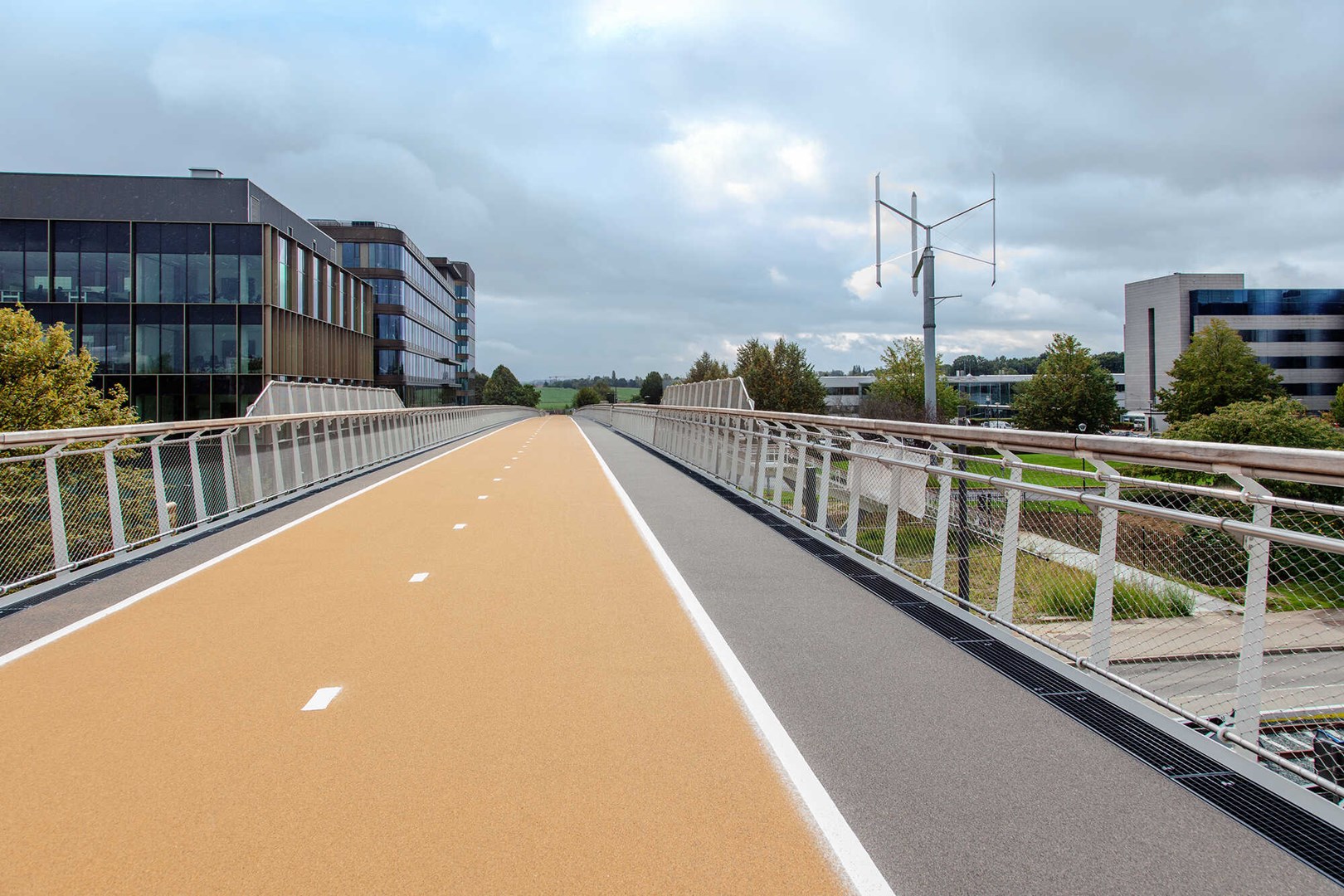 In de drukke stedelijke omgeving was er uiteraard niet alleen aandacht voor de functionele en esthetische inpassingen, maar ook duurzaamheid speelde een belangrijke rol. Zo is er onder meer gestreefd naar een minimale footprint en was er grote aandacht voor een goede waterberging onder de brug. Bovenal zorgt de brug niet alleen voor een veilige oversteek van de Leopold III-Laan, maar vormt deze ook een tot nu toe ontbrekende schakel binnen het fietsnetwerk in de Vlaamse Rand. En daarmee is ook de fietsring straks rond.