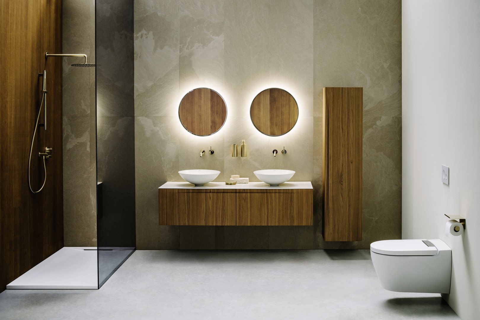 De badkamer wordt hier benaderd als een volwaardige architecturale ruimte, waarin esthetiek, functionaliteit en technologie samenvloeien.