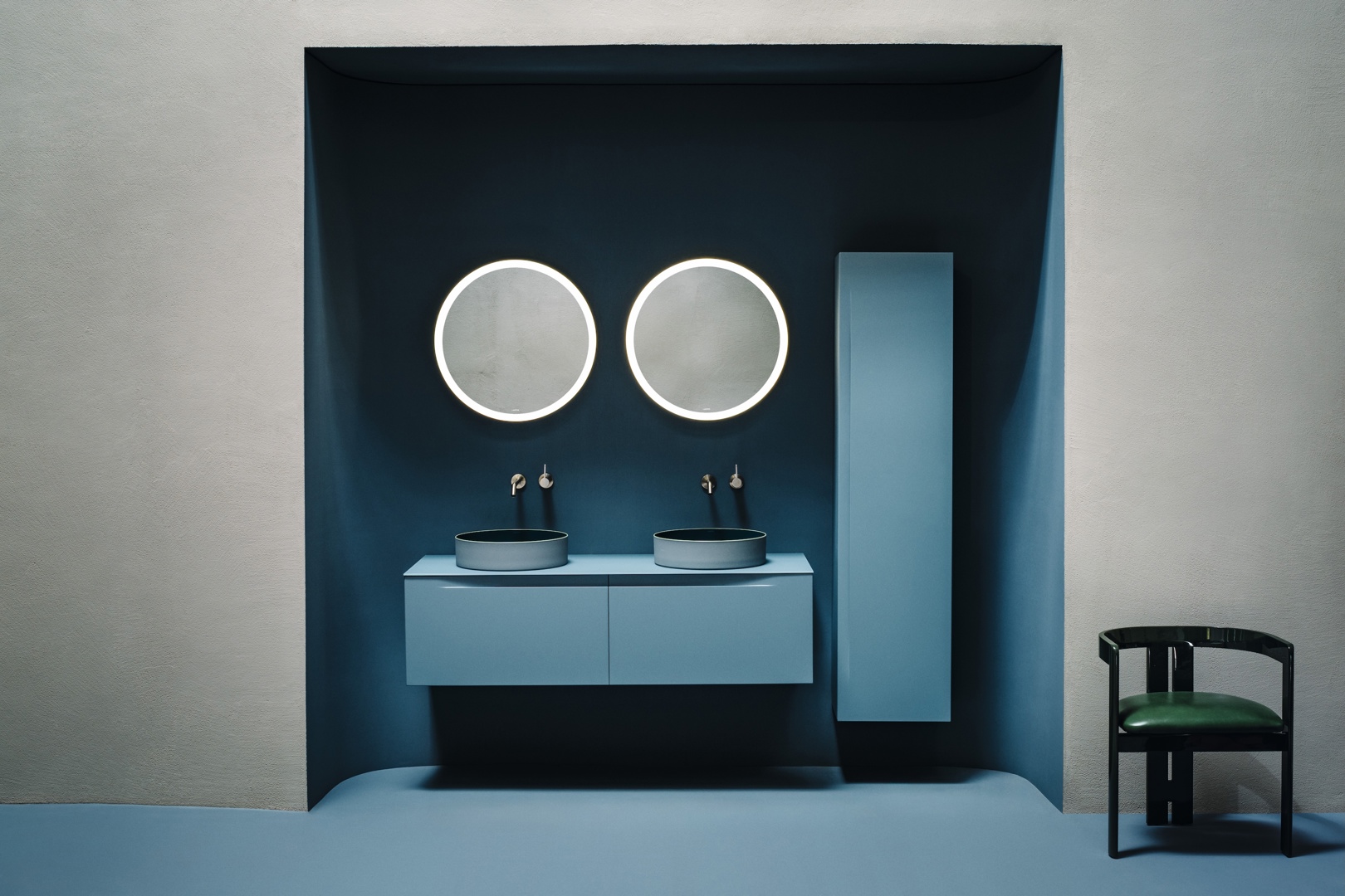 Strakke geometrieën, diepe kleurtonen en zorgvuldig gekozen materialen creëren een ingetogen maar uitgesproken scenografie. Binnen deze setting komen collecties zoals SONAR, THE NEW CLASSIC en ILBAGNOALESSI samen met nieuwe ontwikkelingen, waaronder de VOLTA-wastafels van Yves Béhar.