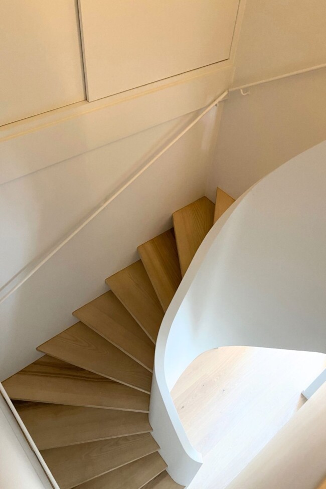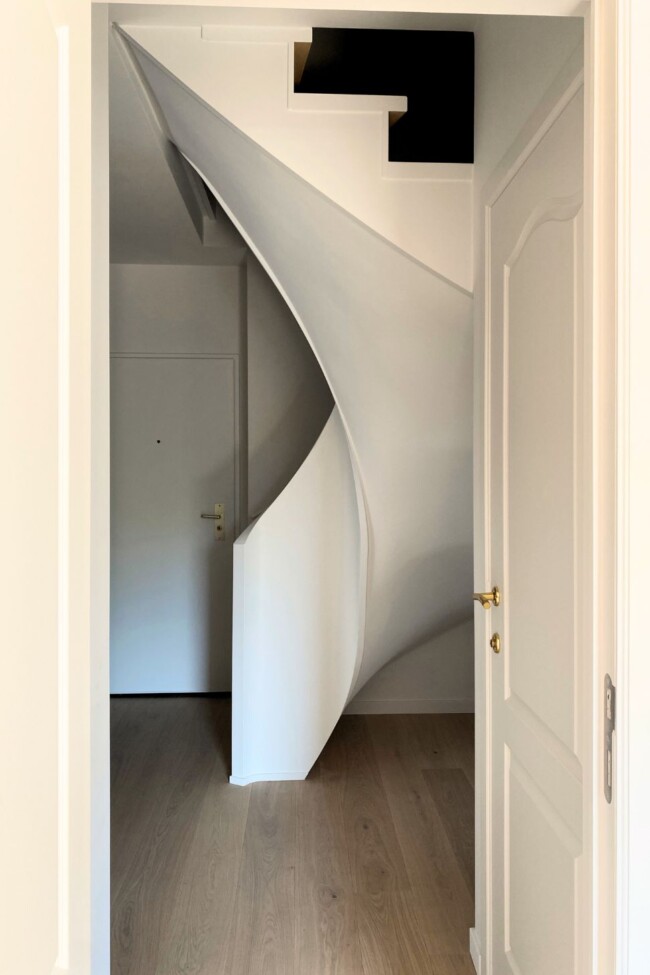 Een doorlopende vloerafwerking versterkt de samenhang tussen de ruimtes en laat het duplexappartement als één geheel lezen. In de inkomhal fungeert een op maat gemaakte trap als schakel tussen de niveaus, waarbij functionaliteit en vormgeving samenvallen. Het maatwerk beperkt zich niet tot kasten of vaste elementen, maar stuurt de volledige ruimtelijke ervaring.