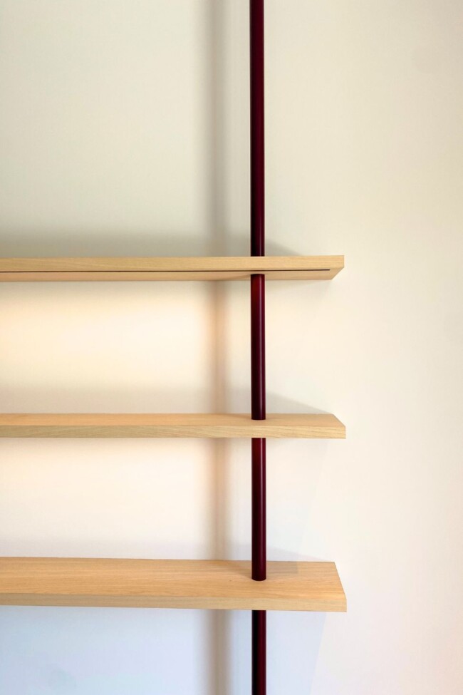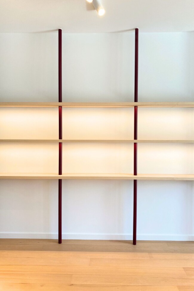 Ook hier zet de zachte vormentaal zich door. Ronde lijnen en afgeronde hoeken temperen de strengheid van het maatwerk en zorgen voor een vloeiende overgang tussen de verschillende elementen. Bordeaurode accenten, onder meer in kolommen en details, verankeren de ruimte en leggen verbanden met andere delen van het appartement.