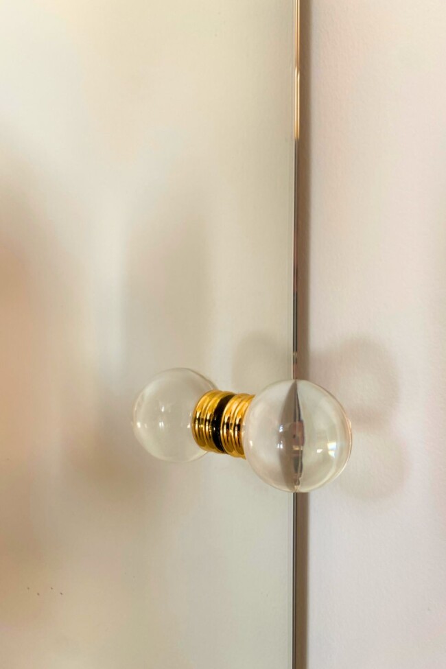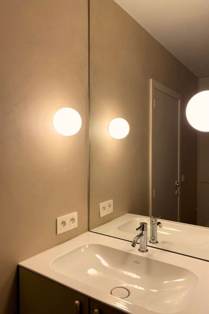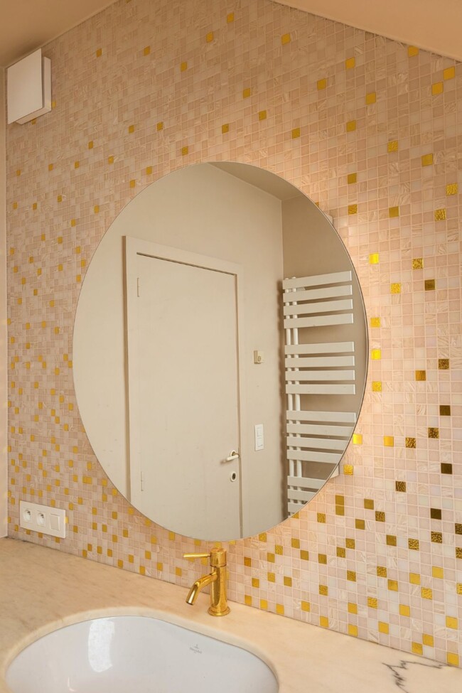 De renovatie ging gepaard met een grondige technische update: alle installaties werden vernieuwd en beide badkamers volledig hertekend. Wat voordien compact en weinig uitgesproken was, maakt plaats voor ruimtes met meer adem en een duidelijke materialiteit. Vooral de masterbadkamer krijgt een uitgesproken karakter, met een roos-goudkleurige mozaïek, natuursteen en zachte tinten die het licht warm reflecteren.