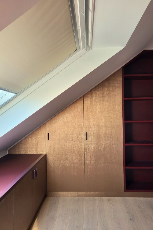 Dat principe wordt verder doorgetrokken in de bureaukamer, waar gesloten kasten in een Homapal-afwerking worden gecombineerd met open structuren in bordeaux. Doorheen het appartement ontstaat zo een consistent palet van materialen en kleuren, waarin es, natuursteen en zachte roze tinten worden aangevuld met gerichte accenten. De relatie met de omgeving blijft daarbij voelbaar: de dagelijkse tocht langs de Schelde vertaalt zich in een interieur dat rust en samenhang uitstraalt.