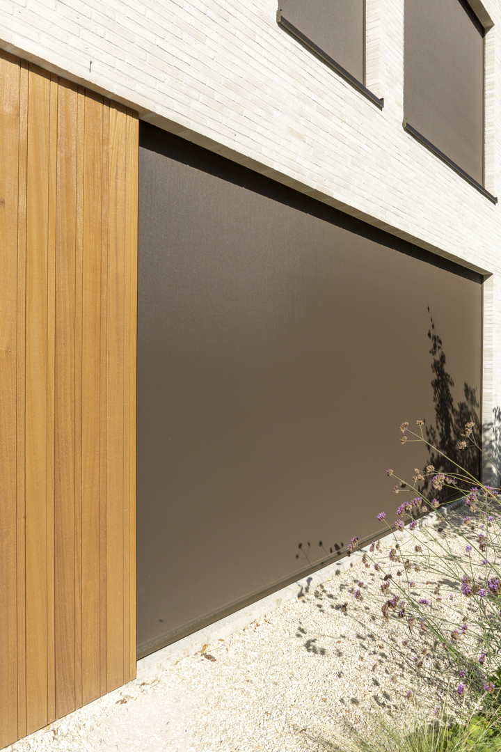 De screens werden bovendien naadloos geïntegreerd in het architecturale concept. het ontwerp van de woning, wat zorgt voor een harmonieus en strak geheel. De kleur van de geleiders en de onderlat is zorgvuldig afgestemd op de raamprofielen en sluit mooi aan bij de totale esthetiek. Verder werd de doekkleur gekozen in harmonie met de gevelsteen en de houtaccenten van de woning.