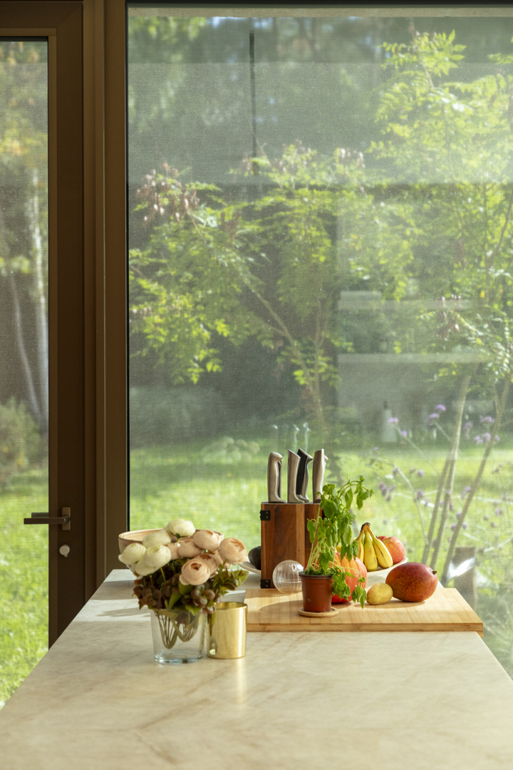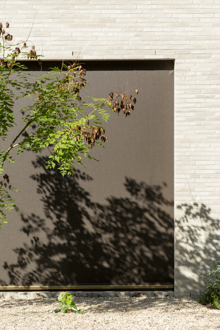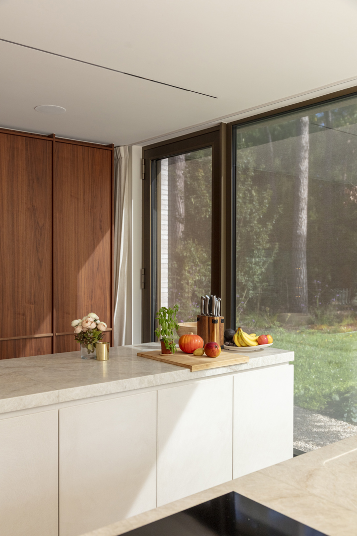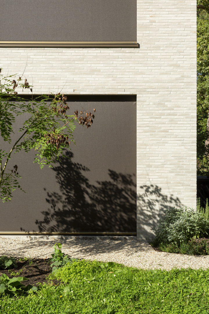 De grote raampartijen zorgen voor veel lichtinval en een sterke connectie met de tuin. Om oververhitting en hinder door de laagstaande zon te vermijden, werd gekozen voor geïntegreerde zonwering in de vorm van onzichtbaar weggewerkte screens.