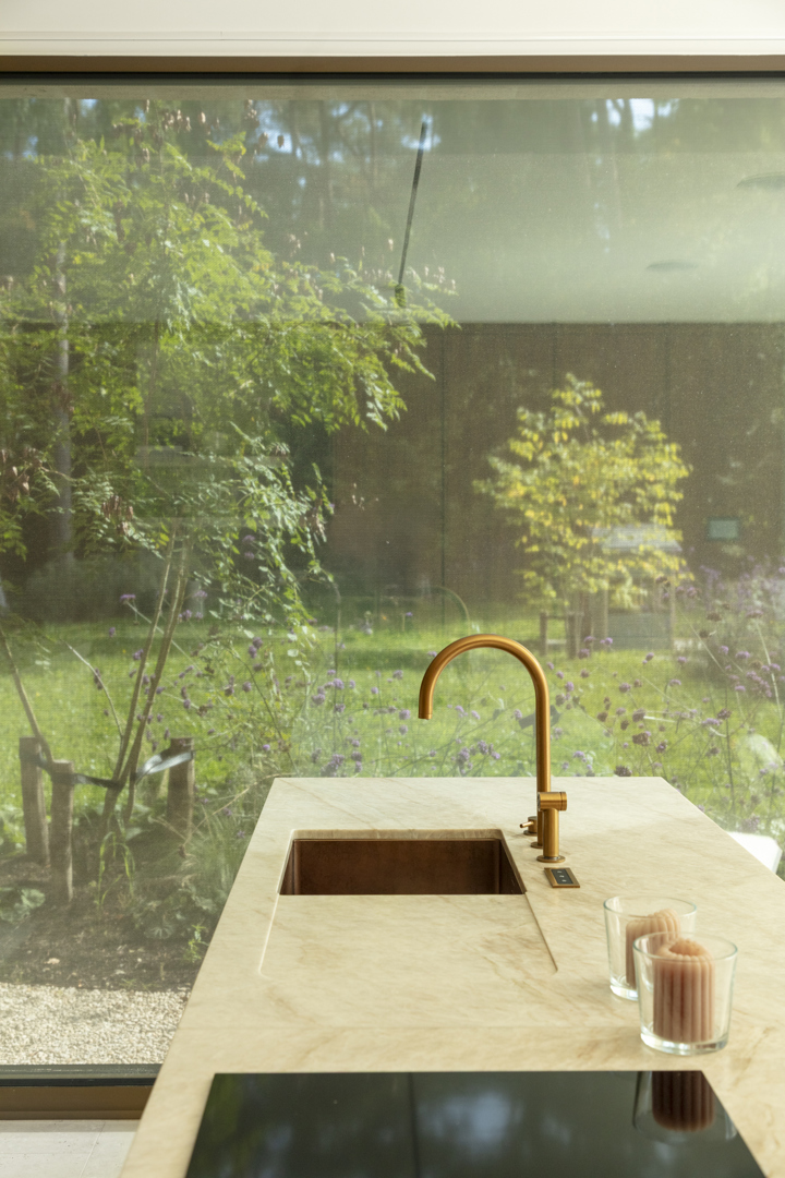 De oriëntatie van de woning werd meegenomen in het ontwerp. Zo schermt het volume zich af van het zuiden, terwijl het zich opent naar het oosten en westen. Deze strategische positionering optimaliseert de lichtinval en ondersteunt tegelijk het thermisch comfort. Het materiaalpallet is zacht en rustig met warme materialen.