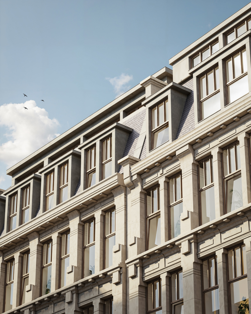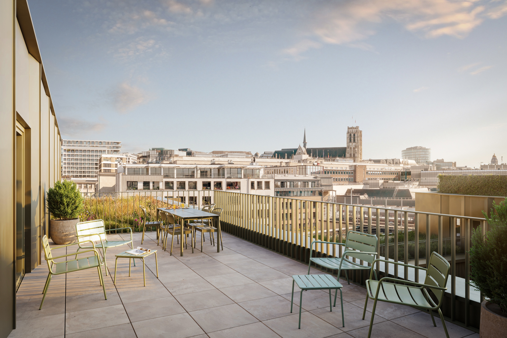 De relatie met de stad wordt expliciet op het gelijkvloers gemaakt, waar LOW inzet op doorwaadbaarheid en publieke leesbaarheid. “Met een soort binnenstraat maken we de verbinding met de straatkant, wat een fantastische stedelijke connector wordt. In plaats van functies bovenin weg te stoppen, houden we ze op het straatniveau,” klinkt het. Die keuze is meer dan een circulatiemaatregel: ze positioneert de residentie als stedelijk adres, waarbij collectieve ruimtes niet verdwijnen in de bovenbouw maar het straatleven mee “aankoppelen”. Als extra laag bovenop het erfgoedvolume komt er bovendien “een panoramisch dakterras met fenomenaal zicht op de stad,” waarmee de bovenste kroon van het gebouw een gedeelde, niet-private bestemming krijgt.